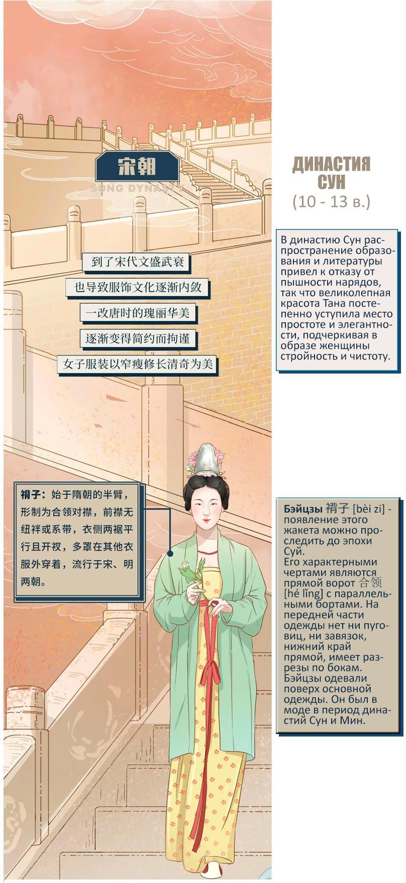В династию Сун распространение образования и литературы привел к отказу от пышности нарядов, так что великолепная красота Тана постепенно уступила место простоте и элегантности, подчеркивая в образе женщины стройность и чистоту.
