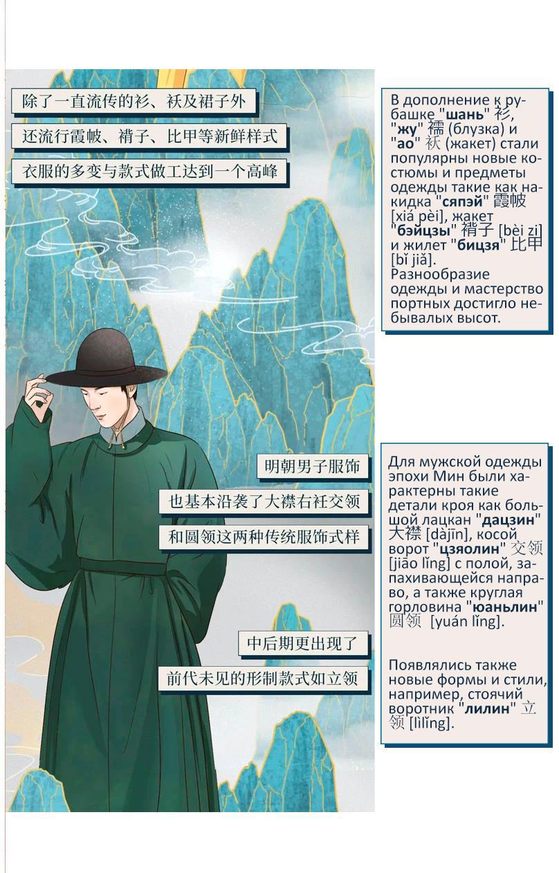 Для мужской одежды эпохи Мин были характерны такие детали кроя как большой лацкан "дацзин" 大襟 [dàjīn], косой ворот "цзяолин" 交领 [jiāo lǐng] с полой, запахивающейся направо, а также круглая горловина "юаньлин" 圆领 [yuán lǐng].