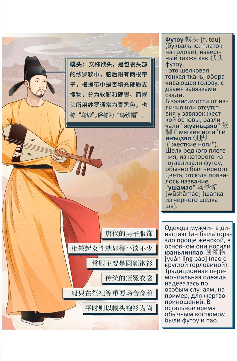 Одежда мужчин в династию Тан была гораздо проще женской, в основном они носили юаньлинпао 圆领袍 [yuán lǐng páo] (пао с круглой горловиной). Традиционная церемониальная одежда надевалась по особым случаям, например, для жертвоприношений. В остальное время обычным костюмом были футоу и пао.