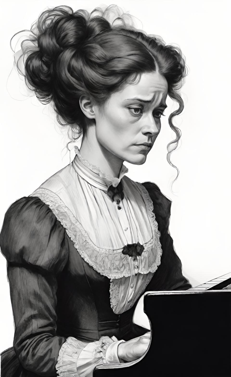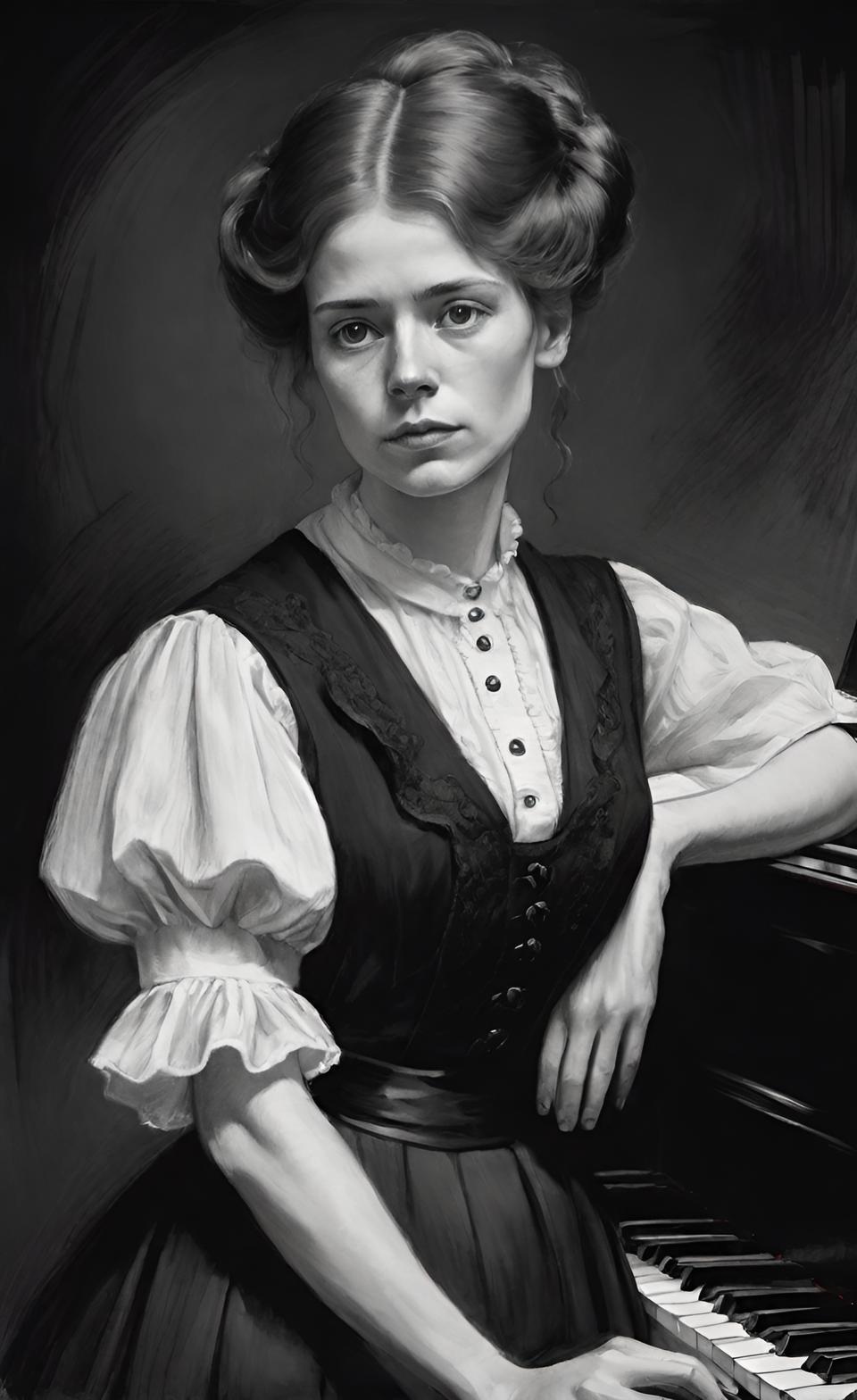 Тут мне не нравится сельский костюмчик, и личность, имхо, больше видна на предыдущей. Она все-таки пианистка с мировым именем, хоть и в трудных жизненных обстоятельствах, а не деревенская барышня, взятая в горничные. Но меня не затруднит, в принципе, пересадить голову на городское платье. Словом, если кто-то из читавших повесть имеет аргументированное мнение, я буду очень рада его узнать.