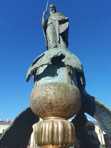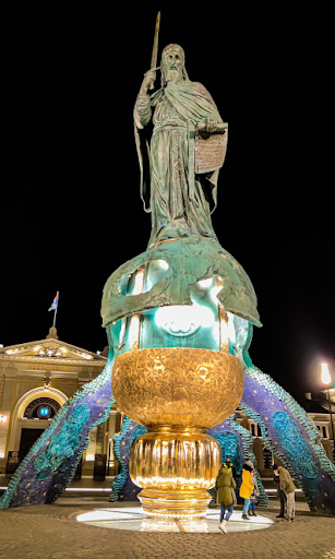 Памятник сам по себе с историей, поэтому позволю себе небольшой рассказ о нем. Напротив бывшего здания вокзала стоит на постаменте в виде разбитого византийского шлема фигура Стефана Немани. Памятник достаточно массивный: он достигает высоты 23 метра и весит 65тоннн. В правой руке Стефана Немани меч, а в левой свиток Хиландарской грамоты – аналог Сербской декларации независимости.