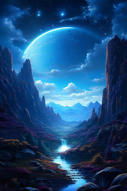 Фэнтезийная долина, луна, небо, красота.