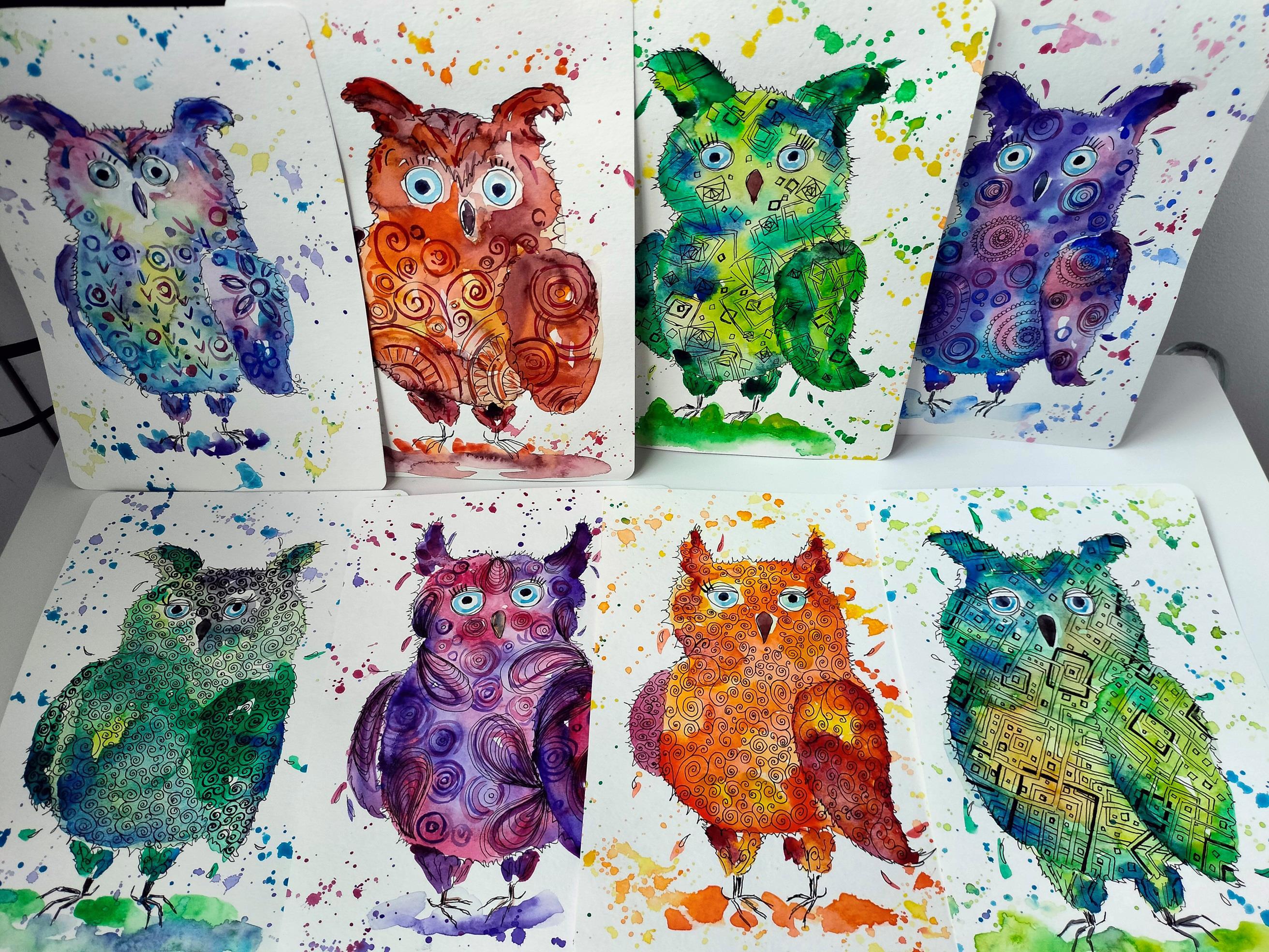 Но зато, пока развлекала дочь, сама порисовала наконец-то. Получились вот такие прикольные акварельные совушки! Часть из них пойдёт в подарок моим друзьям по переписке, и для благотворительной ярмарки отложу и нарисую ещё