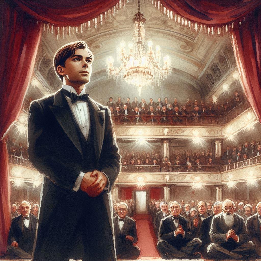 Из кулис вышел тут артист в смокинге, гладко выбритый и причесанный на пробор, молодой и с очень приятными чертами лица.