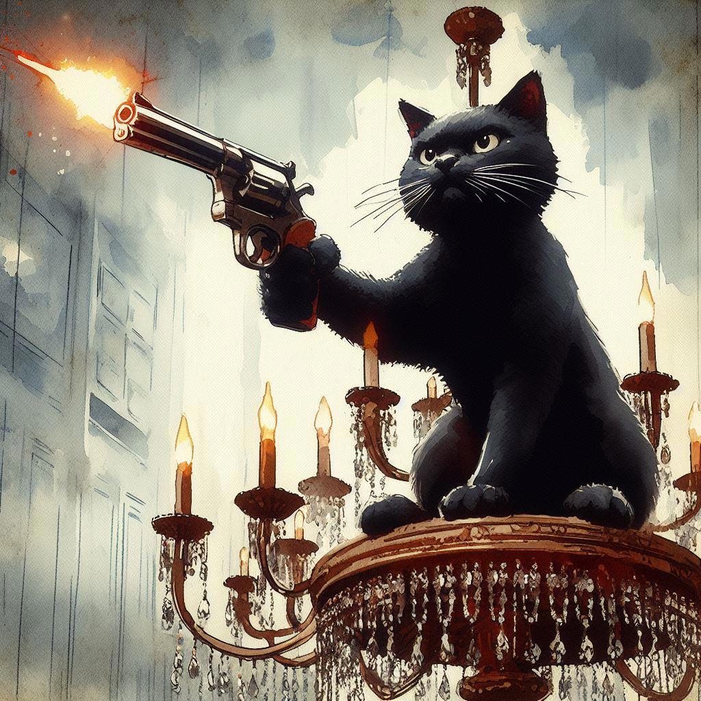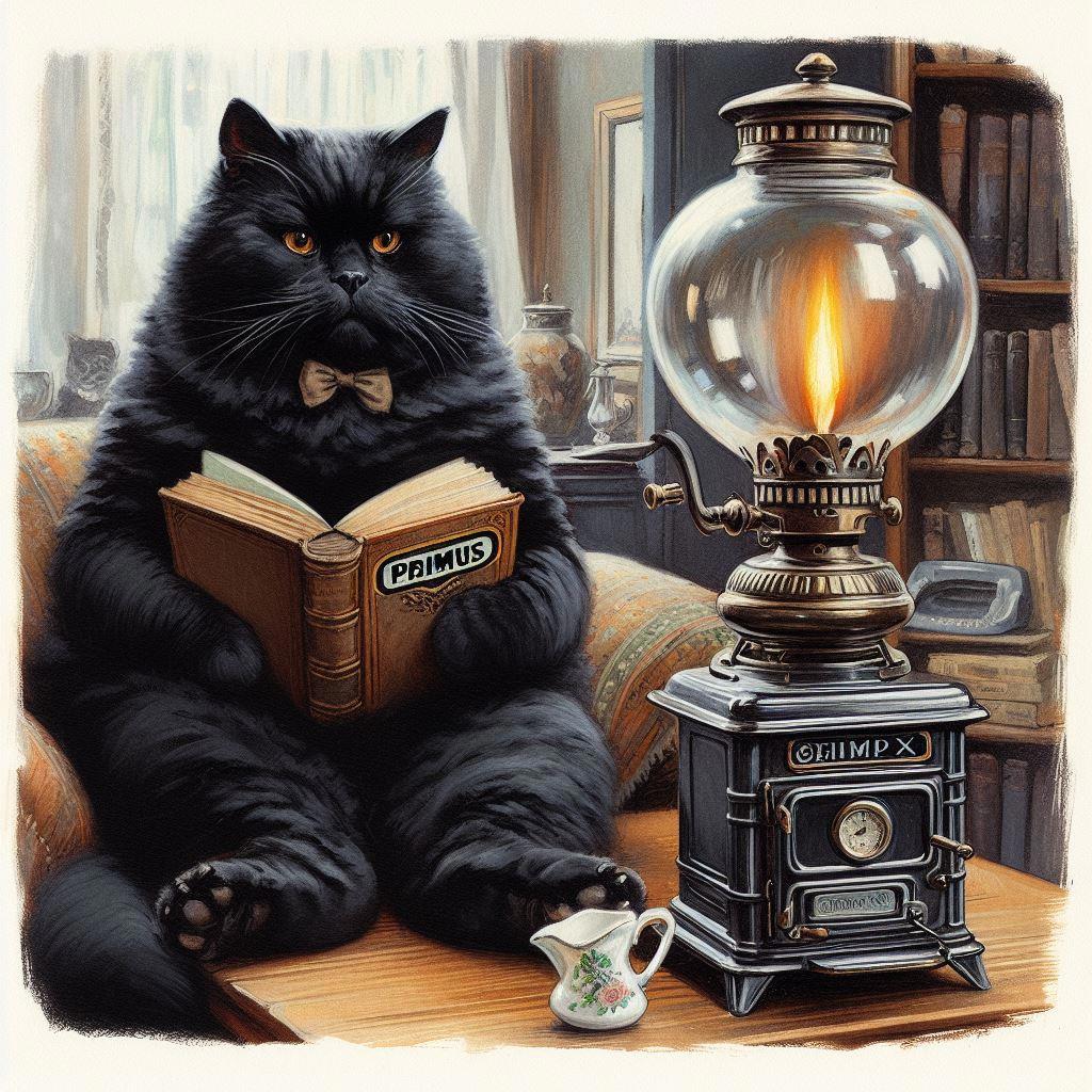 , недавняя банда "Чёрная кошка", захватившая Сметанный дворец, представляла собой подборку не соответствовавших тексту Булгакова Бегемотов с люстрой. А вот Бегемот, соответствующий тексту; к сожалению, моя нейросеть не знает, как устроен привычный для нас примус, так что будем считать, что его заслоняет попа Бегемота.
