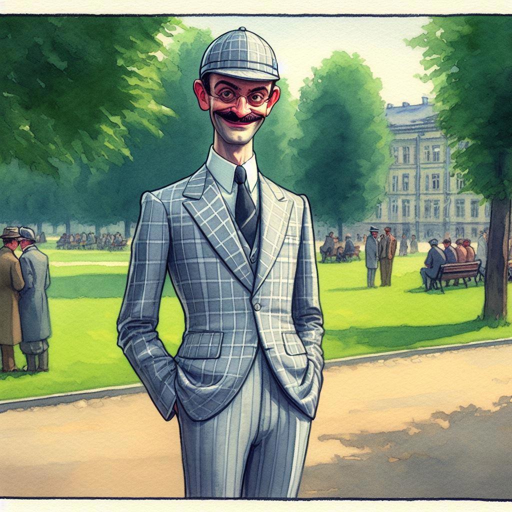 И тут знойный воздух сгустился перед ним, и соткался из этого воздуха прозрачный гражданин престранного вида. На маленькой головке жокейский картузик, клетчатый кургузый воздушный же пиджачок… Гражданин ростом в сажень, но в плечах узок, худ неимоверно, и физиономия, прошу заметить, глумливая.