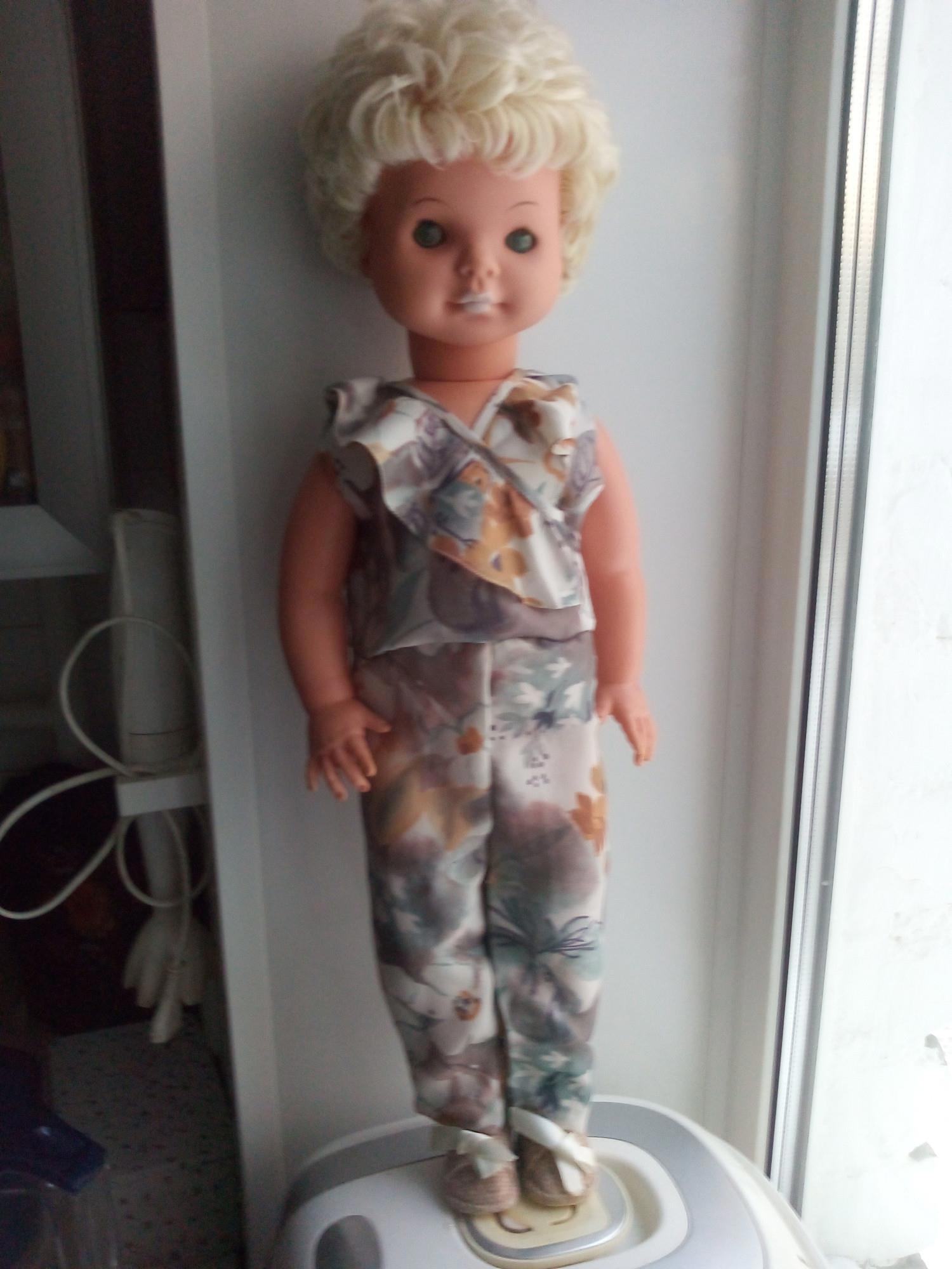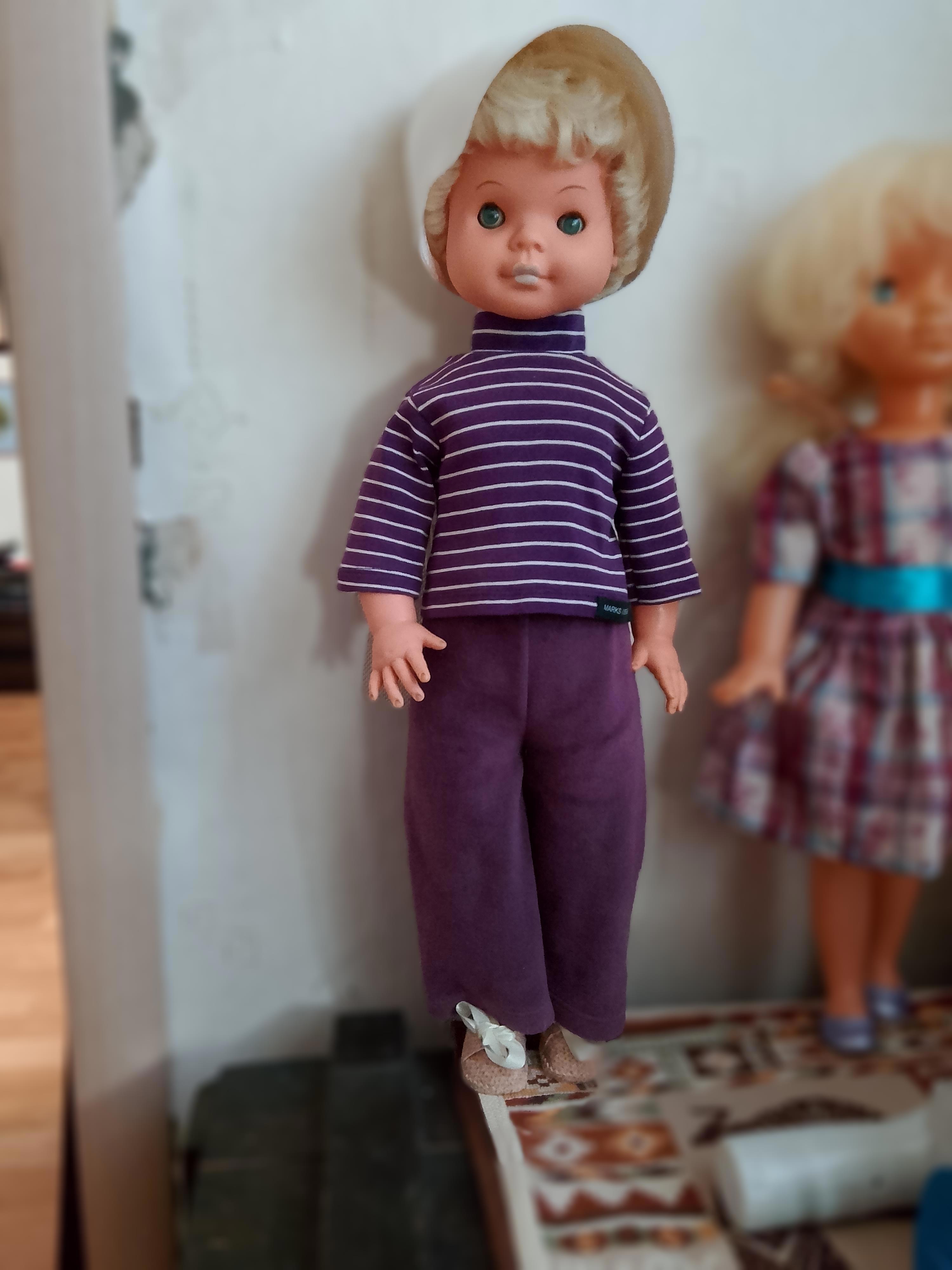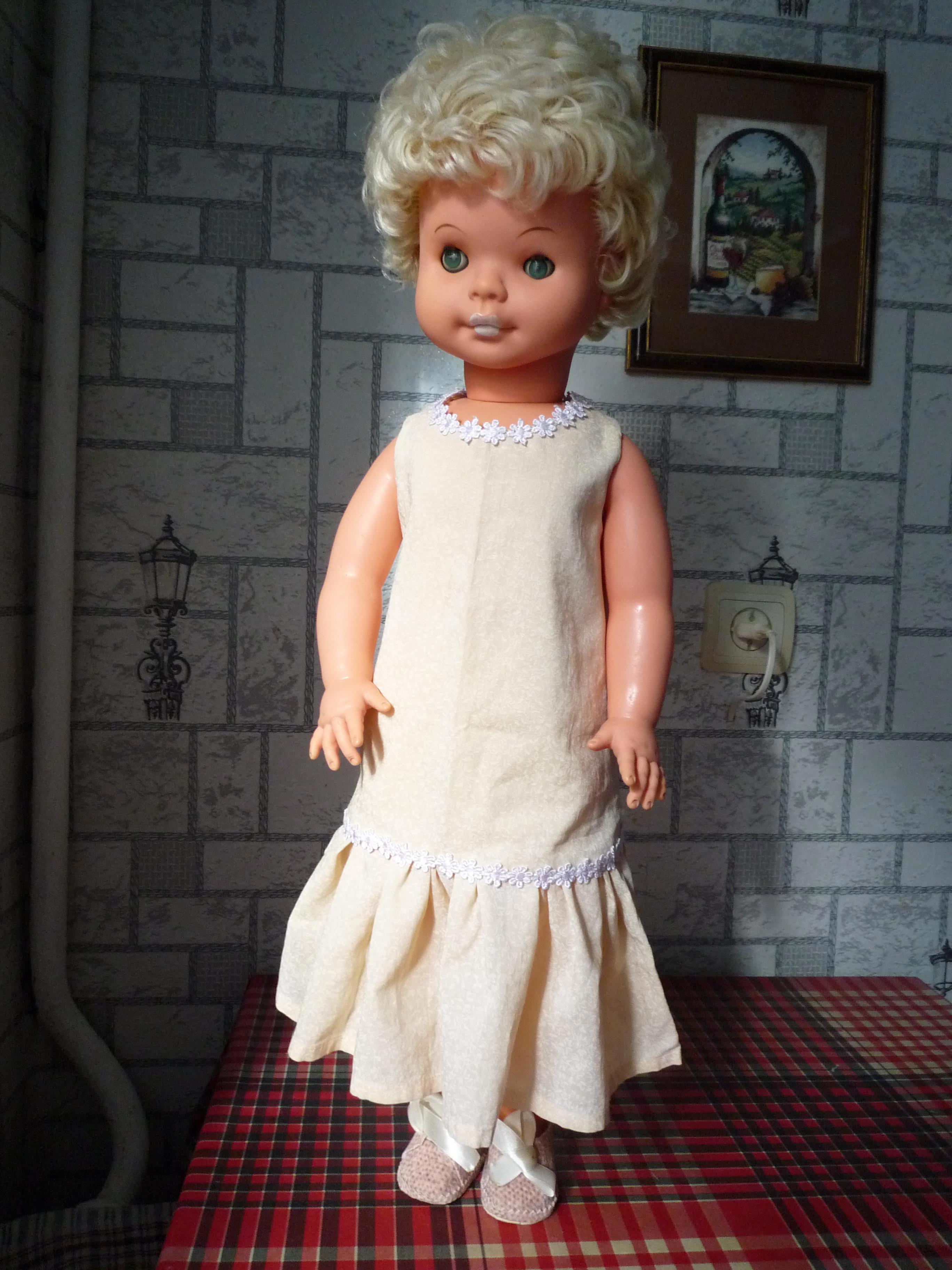 Представляю вам куклу, которая старше меня, а когда-то была и больше. Немецкая кукла, которую отцу подарили сослуживцы на мое рождение. Признаться, в детстве я ее не любила, она казалась мне громоздкой... и вообще. В ней 60 см. Коротнуло меня несколько лет назад когда совершенно случайно я надела на нее панамку и вдруг увидела, какое у нее нежное и грустное лицо. Я восстановила ей волосы (промыла с силиконовым бальзамом и прочесала) и сшила множество одежек. Я бы ещё заменила ей глаза, потому что от времени отн помутнели. Резина, из которой кукла сделана, очень качественная: у меня почернела другая немецкая кукла, которая была намного моложе. С этой все в порядке, кроме того, что ее немного погрыз пудель... но он все погрыз, что застал и достал. Прошу извинить меня за фон, драные обои я собираюсь менять.