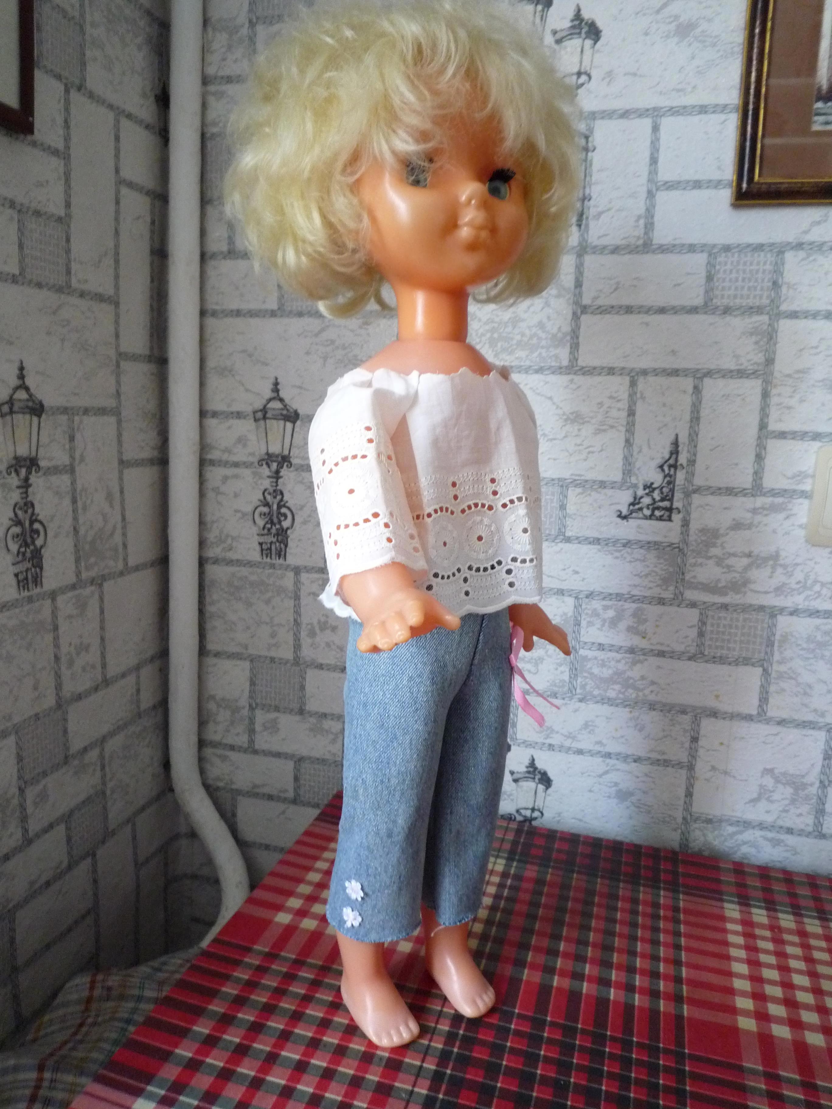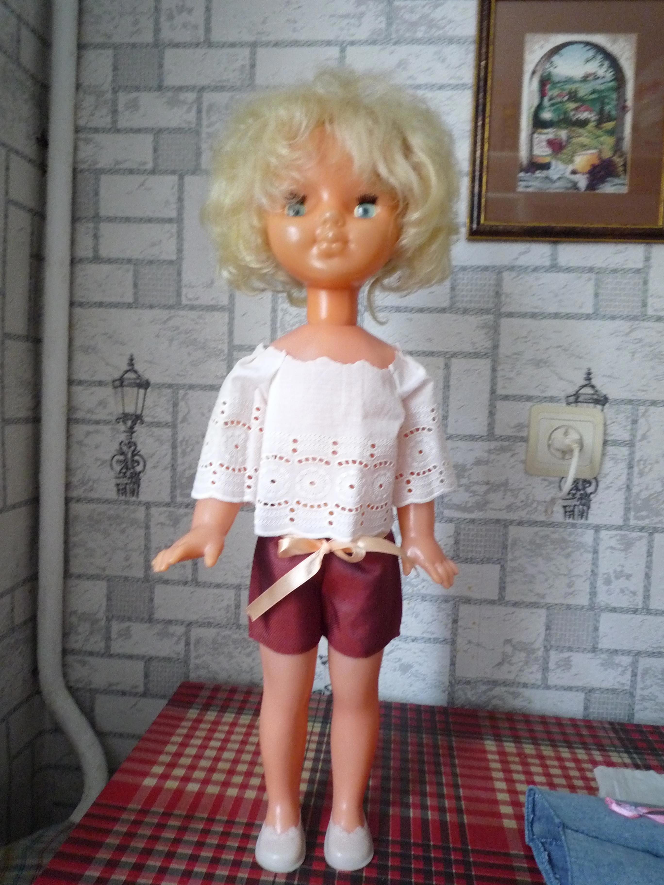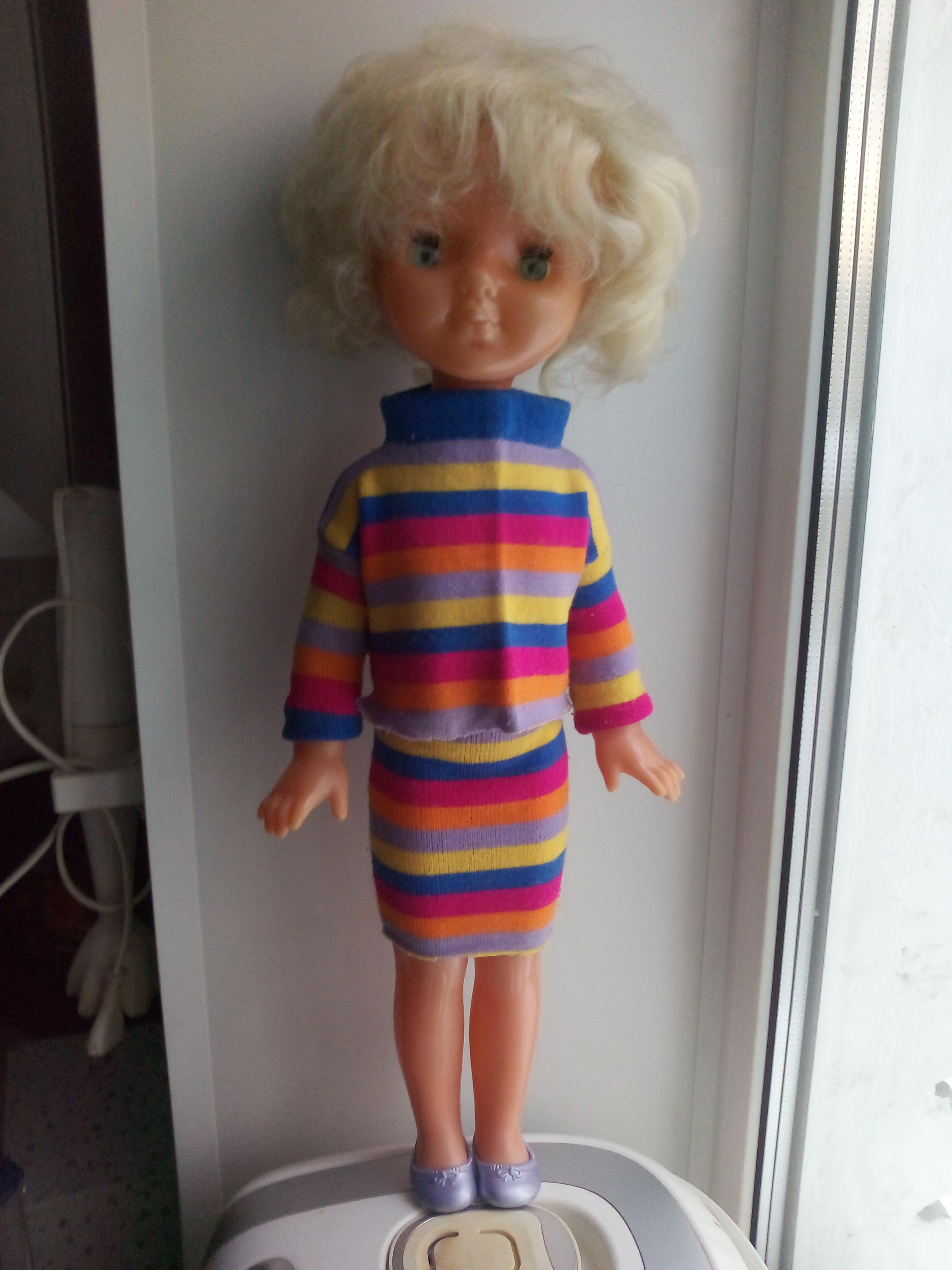 Она, конечно, попроще Дарьи, украинка по происхождению (на ярлыке значилось имя Людмила, но я назвала Катрионой), не из резины, а из глянцевого пластика. Катерине в свое время тоже досталось от пуделя (причем буквально в первую неделю покупки!) и она тоже провела лет двадцать на даче, а потом я ее оттуда перевела в квартиру, приодела, перетянула и провела процедуру восстановления волос. У Кэт тоже достаточно много одежек. В перспективе хочу немного оживить ей лицо новым мейком (мыслю сделать немного поярче губы, и брови надо бы обозначить). Также прикладывала ей к лицу новые волосы, ненасыщенно-рыжие, мне понравилось сочетание. Но пока в этом насущной необходимости нет, она недурно выглядит и с родными.
