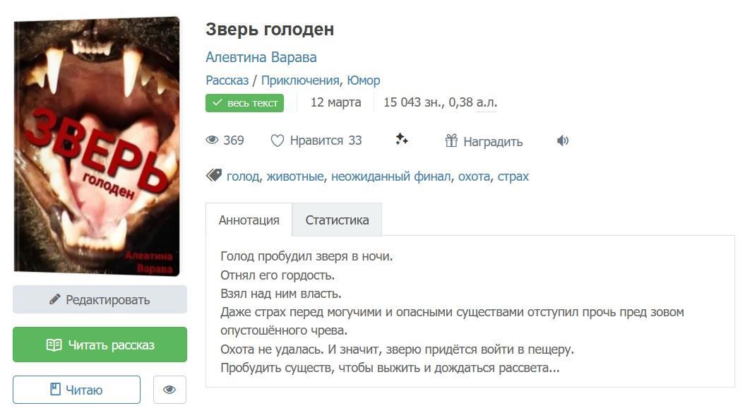 Автор: Алевтина ВараваЗверь очень голоден. Это невозможно терпеть. Зверь готов на всё, чтобы утолить свой голод. Готов даже пробудить существ. Хотя, пробуждённые в ночи, они бывают очень опасны и очень жестоки.