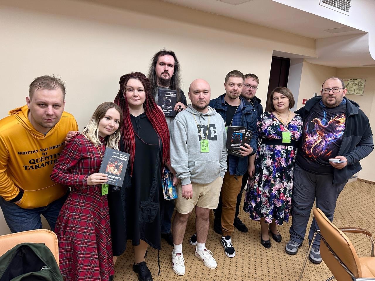 ...так казалось, но потом начался РосКон 2024, куда приехало ещё 200+ человек связанных с миром писательства. Целый десант из топовых авторов АТ, представители издательств, включая главных редакторов АСТ и Эксмо — это лишь то, что вспоминается сразу и не задумываясь. В частности, познакомился с вышеозначенными редакторами и с комрадом Котобусом, вновь смог пообщаться с Антоном Карелиным (который, к слову, стал победителем в номинации за лучший роман) и Михаилом Ланцовым в неформальной обстановке, а так же лично побеседовать на литературные темы с Сергеем Лукьяненко, Олегом Дивовым и Александром Громовым, получив мудрость от разных поколений авторов, так сказать.