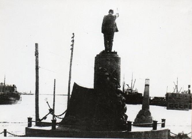 Вот он в 1943 году, после освобождения. На вид-получил только осколочные повреждения, простояв год в оккупации.Но оккупанты задумали хитрый план. Рядом,в здании управления порта, был заложен мощный заряд ВВ. При взрыве его рухнуло бы здание и памятнику досталось.Взрыв должен был прозвучать, когда в сеть будет дан ток.Но саперы нашли хитрую ловушку.