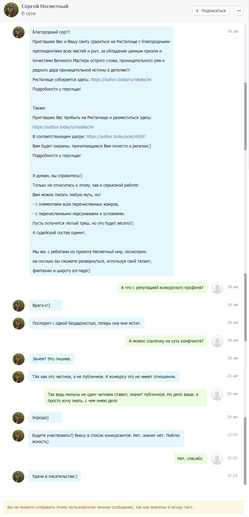 Несколько дней назад на мой комментарий в блоге отреагировал организатор (наверное?) какого-то конкурса. По ссылке я увидел мутный профиль с кармой, забитой в минус и решил не связываться, поскольку мне сказали, что это дело личное и с конкурсом не связанное. Хотя как так, если в минусе именно публичная страница конкурса? В общем, ничего не было понятно и разговор просто ушел в никуда, пока сегодня собеседник не решил уточнить мое решение. Вот чем все закончилось: