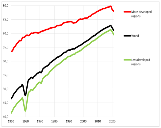 and less developed regions, years, 1950–2021