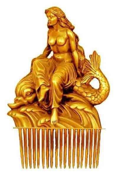 "Для раскопок мы выбрали каменную пирамиду на острове, который носит название Русский Кузов, к сожалению, пирамида оказалась пустой и мы уже собирались закончить работу на острове, когда я попросил рабочих, ни на что особенно не рассчитывая, разобрать небольшую пирамиду, которая находилась метрах в десяти от первой, – докладывал государю Гумилев. – Там, к моей неимоверной радости оказались плотно подогнанные друг к другу камни. Уже на следующий день мы сумели вскрыть это захоронение, сделанное в форме склепа. Викинги не хоронили своих умерших и не строили каменные усыпальницы, на основании чего я сделал вывод, что это захоронение относится к более древней цивилизации. В могиле был скелет женщины, никаких предметов, кроме одного единственного. Около черепа женщины находился золотой гребень удивительной работы, на верху которого девушка в облегающей тунике сидела на спинах двух несущих ее дельфинов".