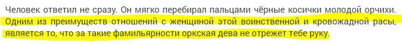это не ошибка? орчиха не отрежет руку? т.е. несмотря на воинственность и кровожадность, есть кто-то более кровожадный? на чьем фоне, общение с орчихой - преимущество? и, получается, перебирание косичек, это более глобальный косяк, нежели секс??? я весь моск сломал, пытаясь понять этот кусочек )))))) а из подобного, весь рассказ состоит. так что пока время есть, займитесь корректурой ;)