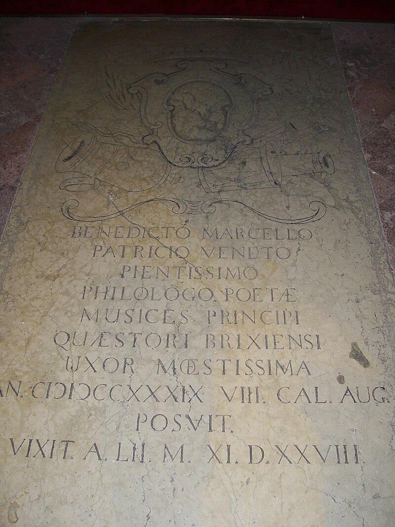Надгробие Бенедетто Марчелло в церкви Сан-Джузеппе в Брешии. Надпись на латыни: Бенедикт Марчелло, патриций Светлейшей Венеции, князь философии, поэзии, музыки, губернатор Полы, камергер Его Святейшества.