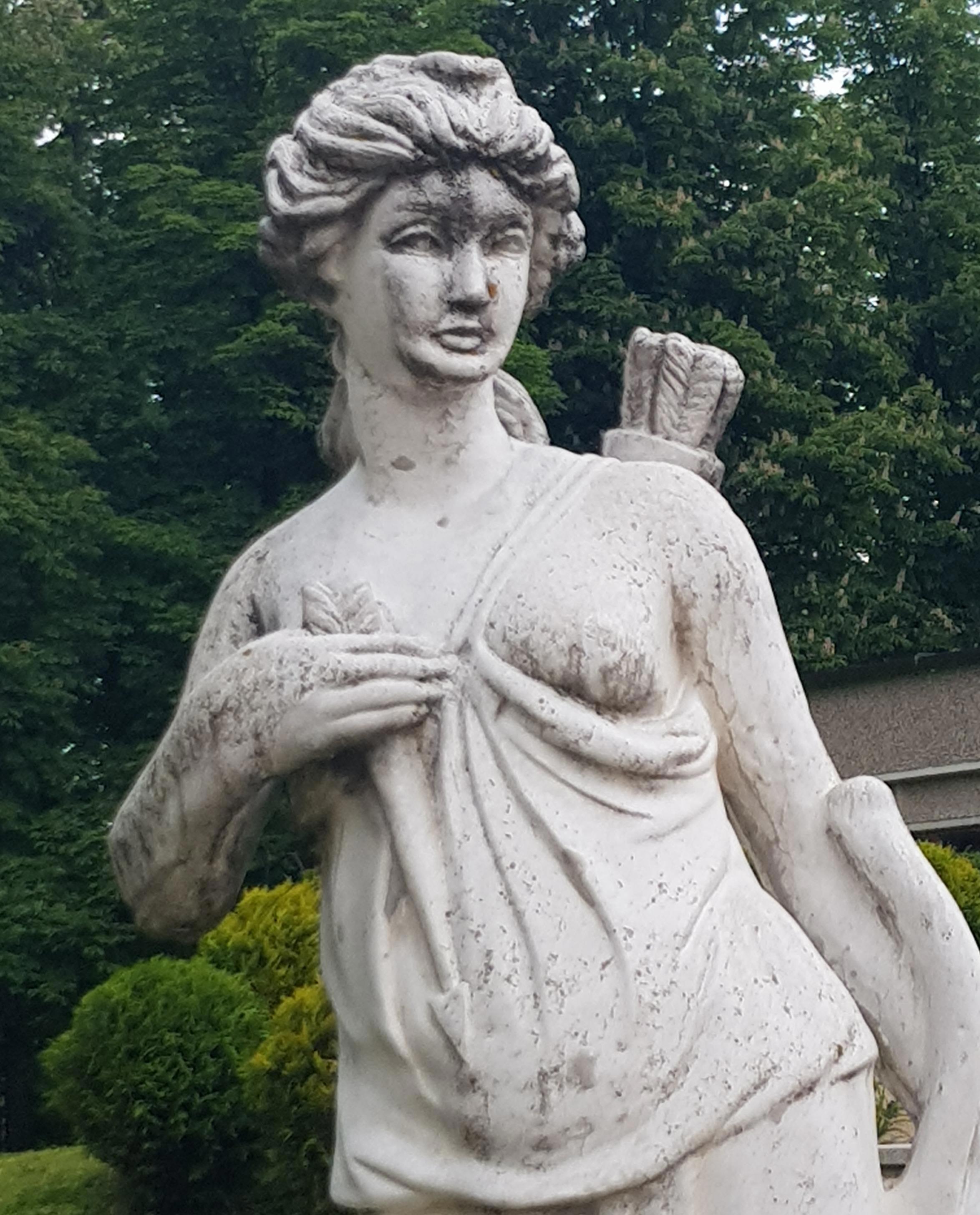 Диана-воительница имеет беспокойный вид, не грудь она прикрывает, лук свой приводит в состояние боеготовности.