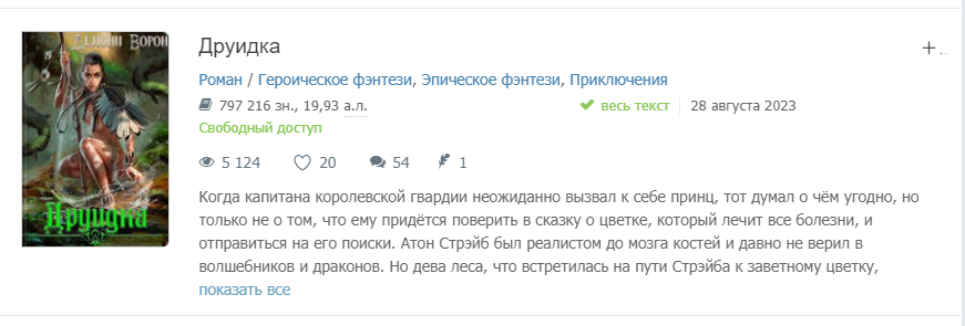 Вторым большим событием для меня стал роман “Друидка”. Больше 5 тысяч просмотров и 20 положительных оценок. Я пишу книги вот уже 4 года, но таких чисел не достиг ещё ни один мой роман. Спасибо все кто читает и прочитал книгу, поставил свою оценку и написал комментарии. Это помогает мне плыть вперёд с утроенной силой.