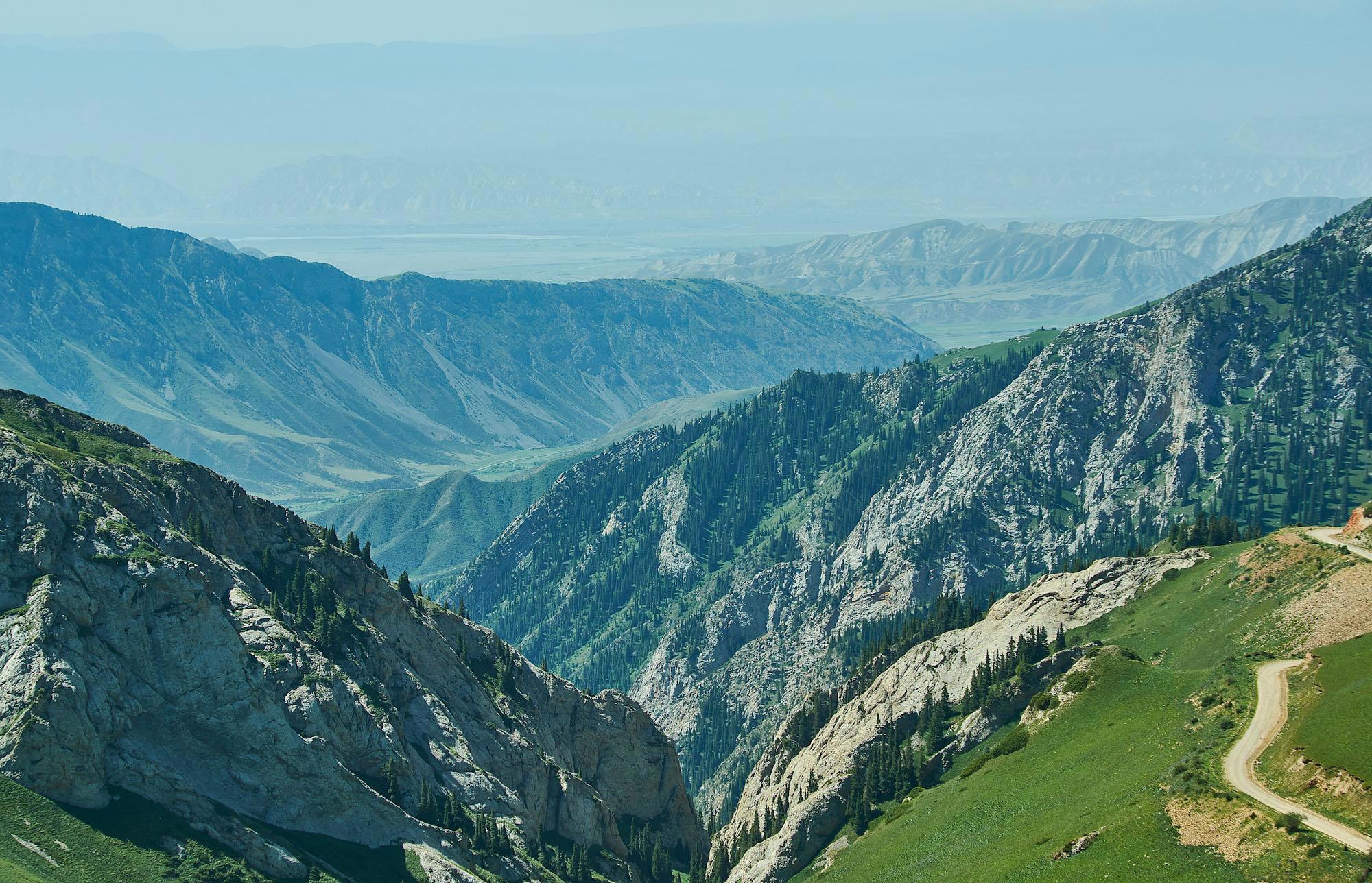 На снимке видна кромка дороги вдоль гребня, идущее дальше ущелье и долина реки Нарын. Вид километров
