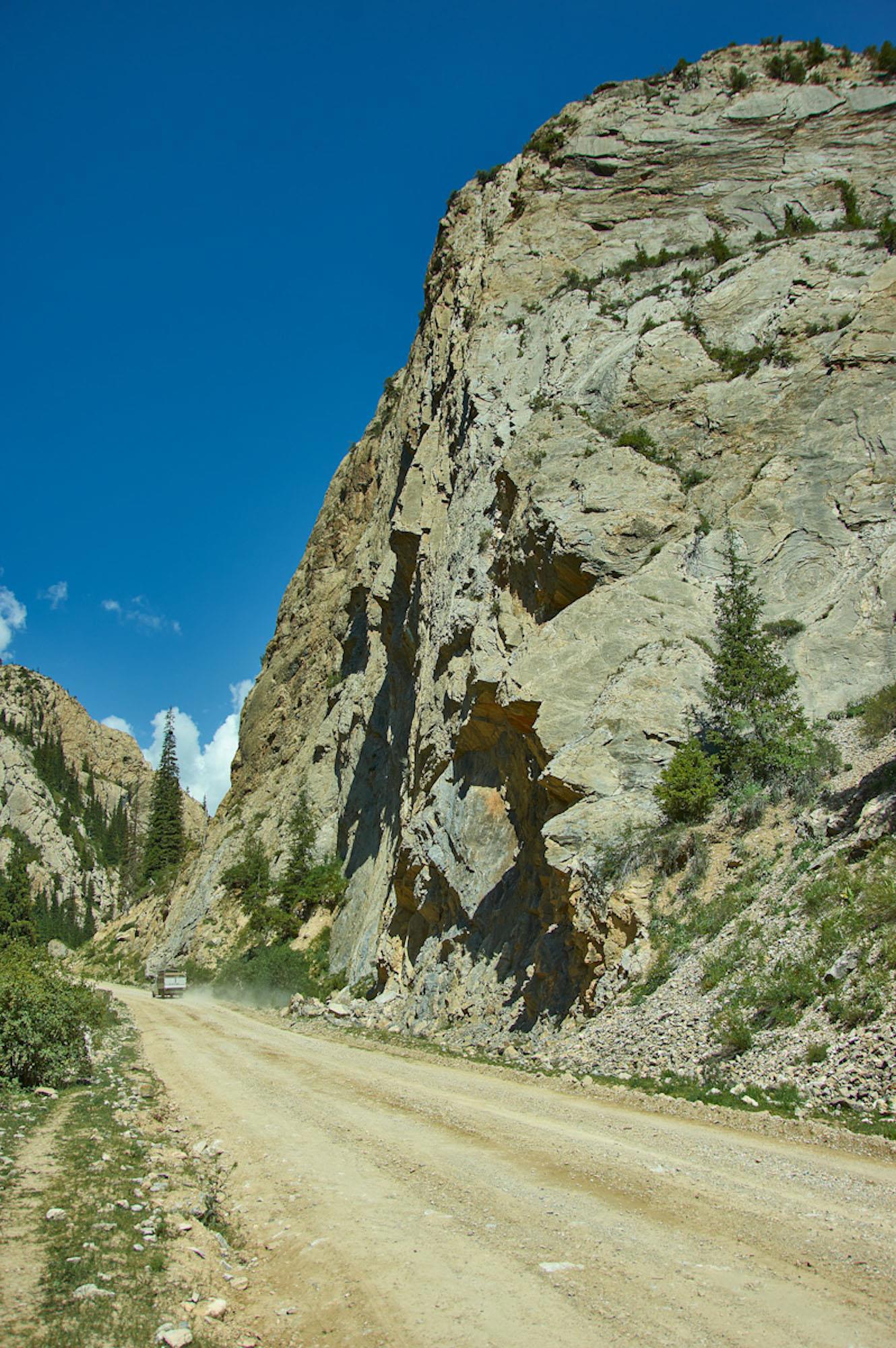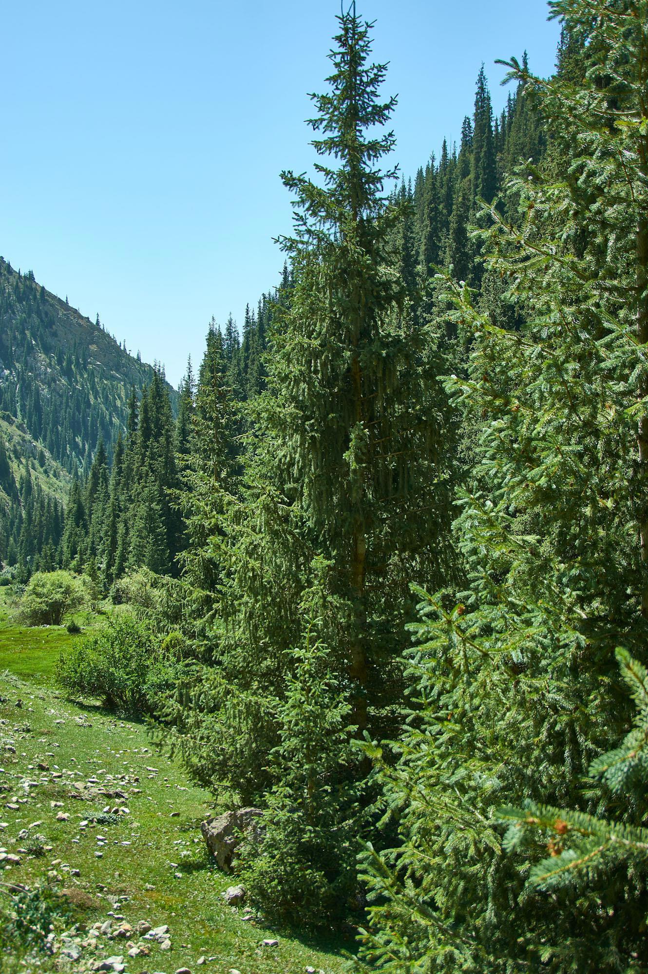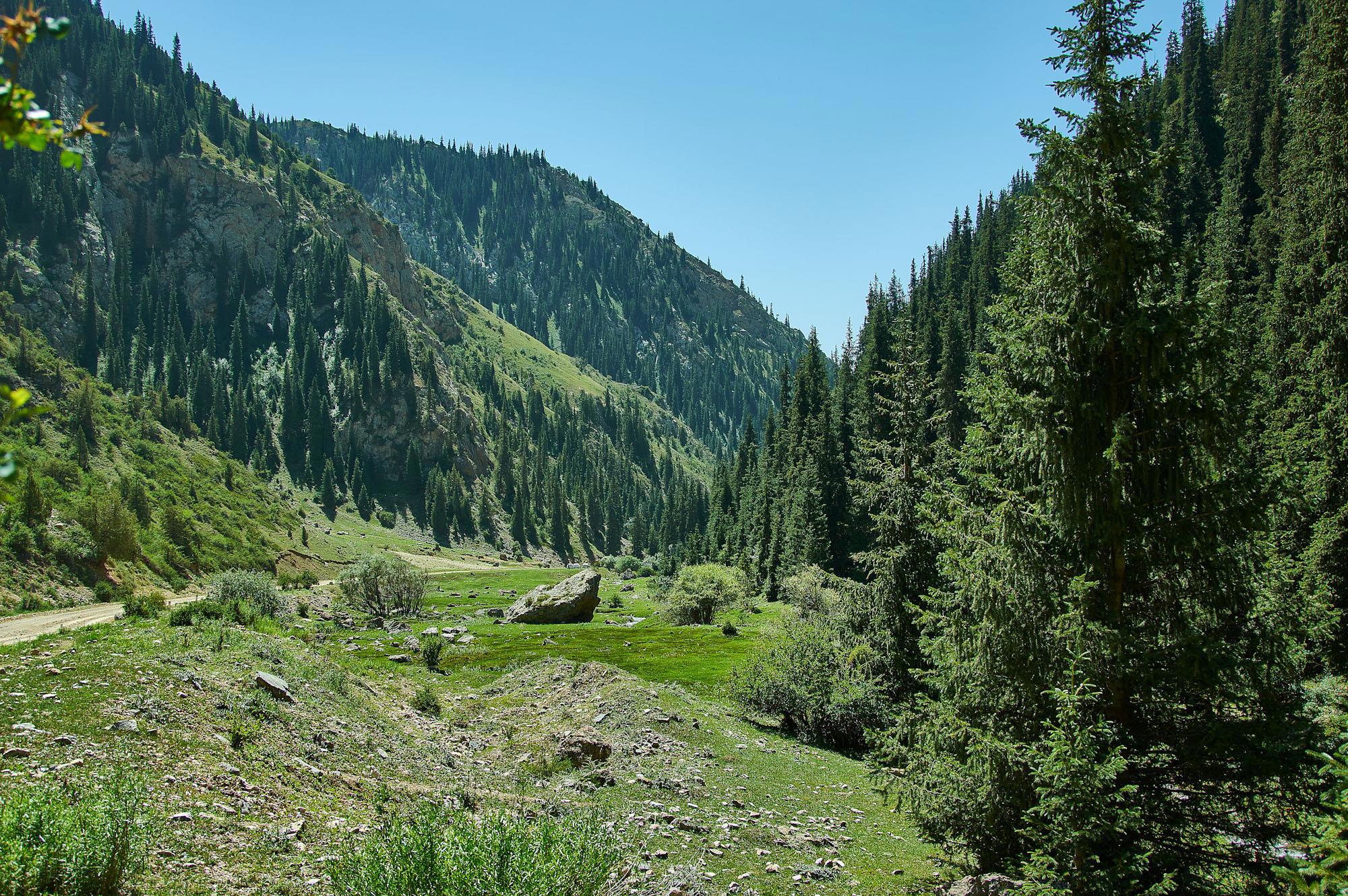 Проскакиваем его относительно быстро, здесь главное тормоза не перегреть, и оказываемся в узком ущелье Дорога идет окруженная изящными тянь-шаньскими елями.