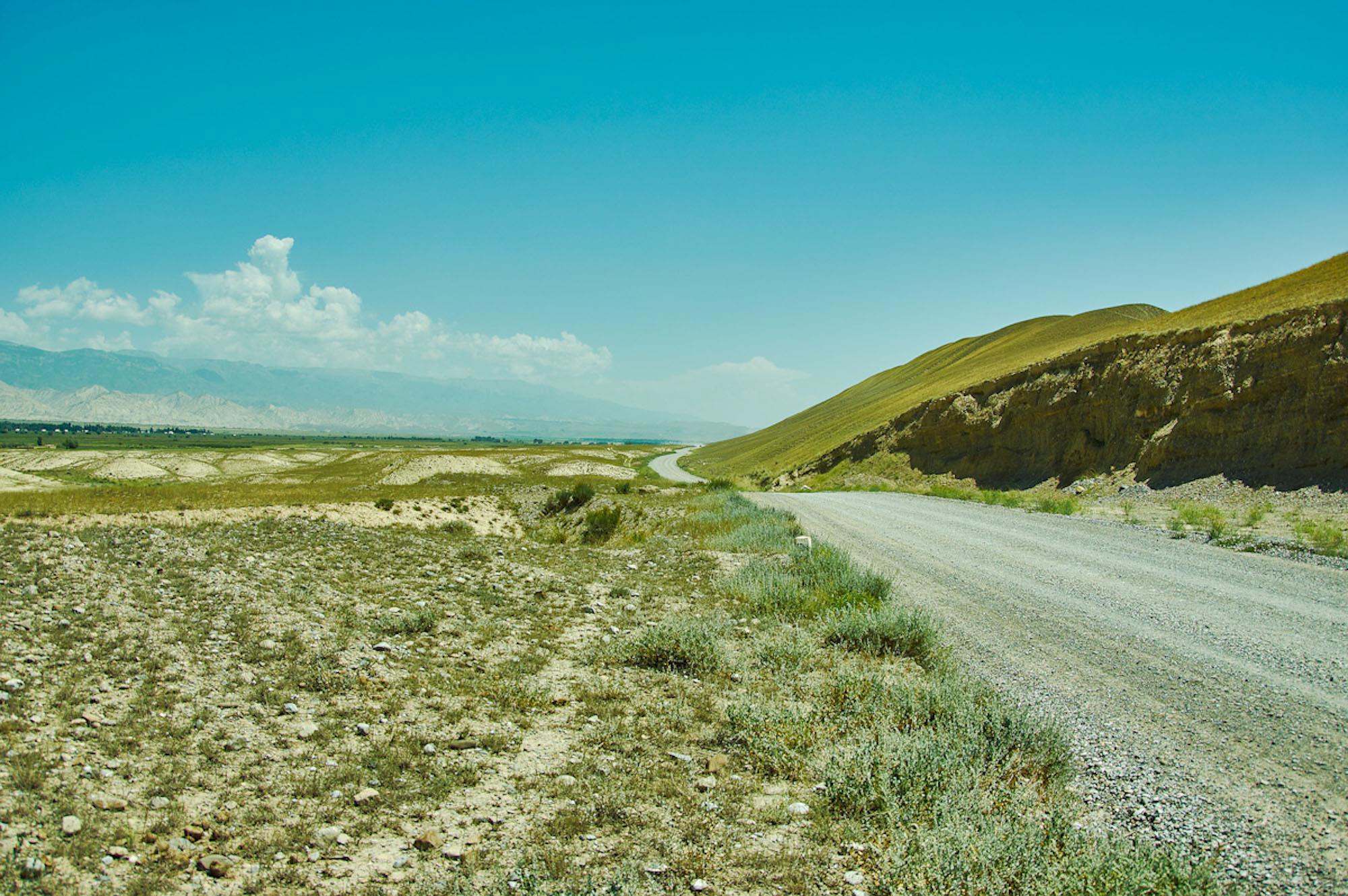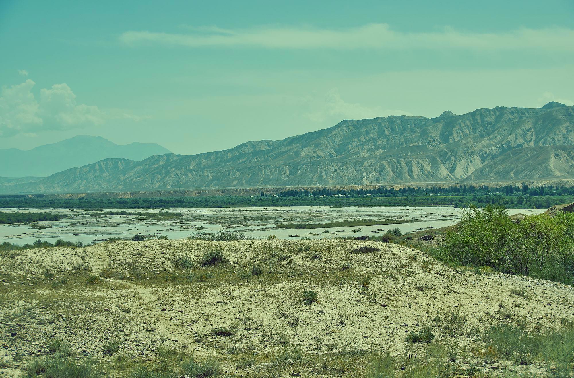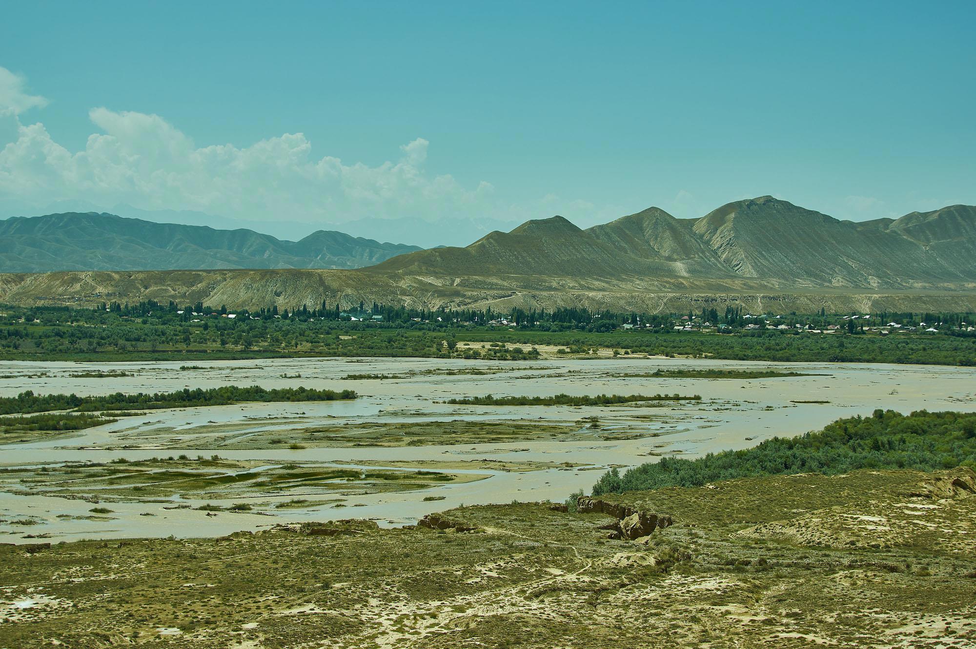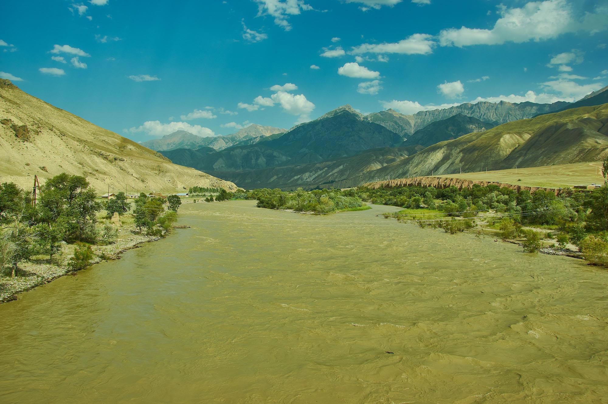 Выжженный солнцем ландшафт. Вот появляется река Нарын. Мутная после дождей, она дает жизнь округе. Вдоль нее видны селения. Она самая многоводная река республики, образованная слиянием рек Большой Нарын и Малый Нарын. Они зарождаются на ледниках Центрального Тянь-Шаня. Общая протяженность реки — 807 километров, а площадь бассейна — 59,9 тысячи квадратных километров
