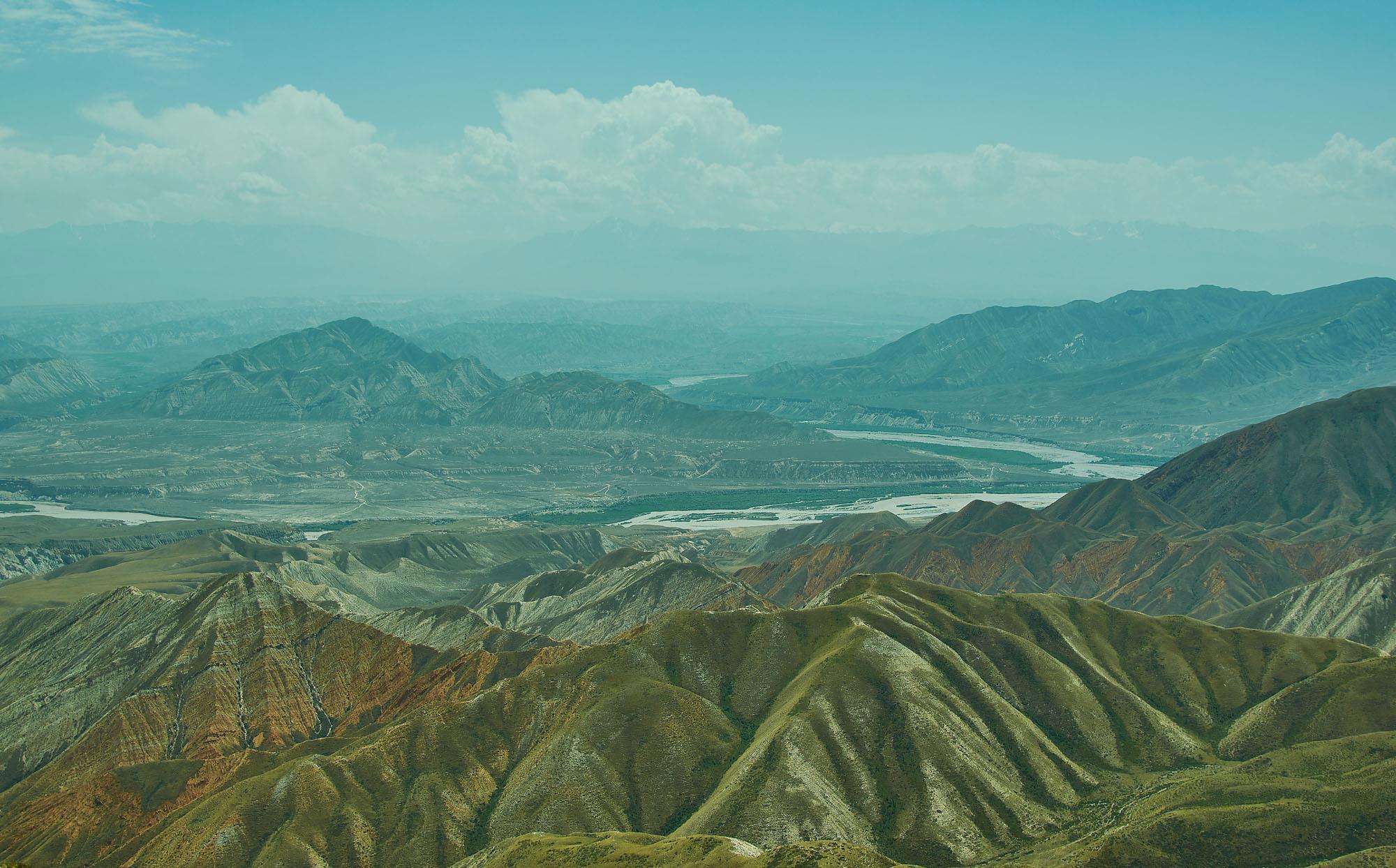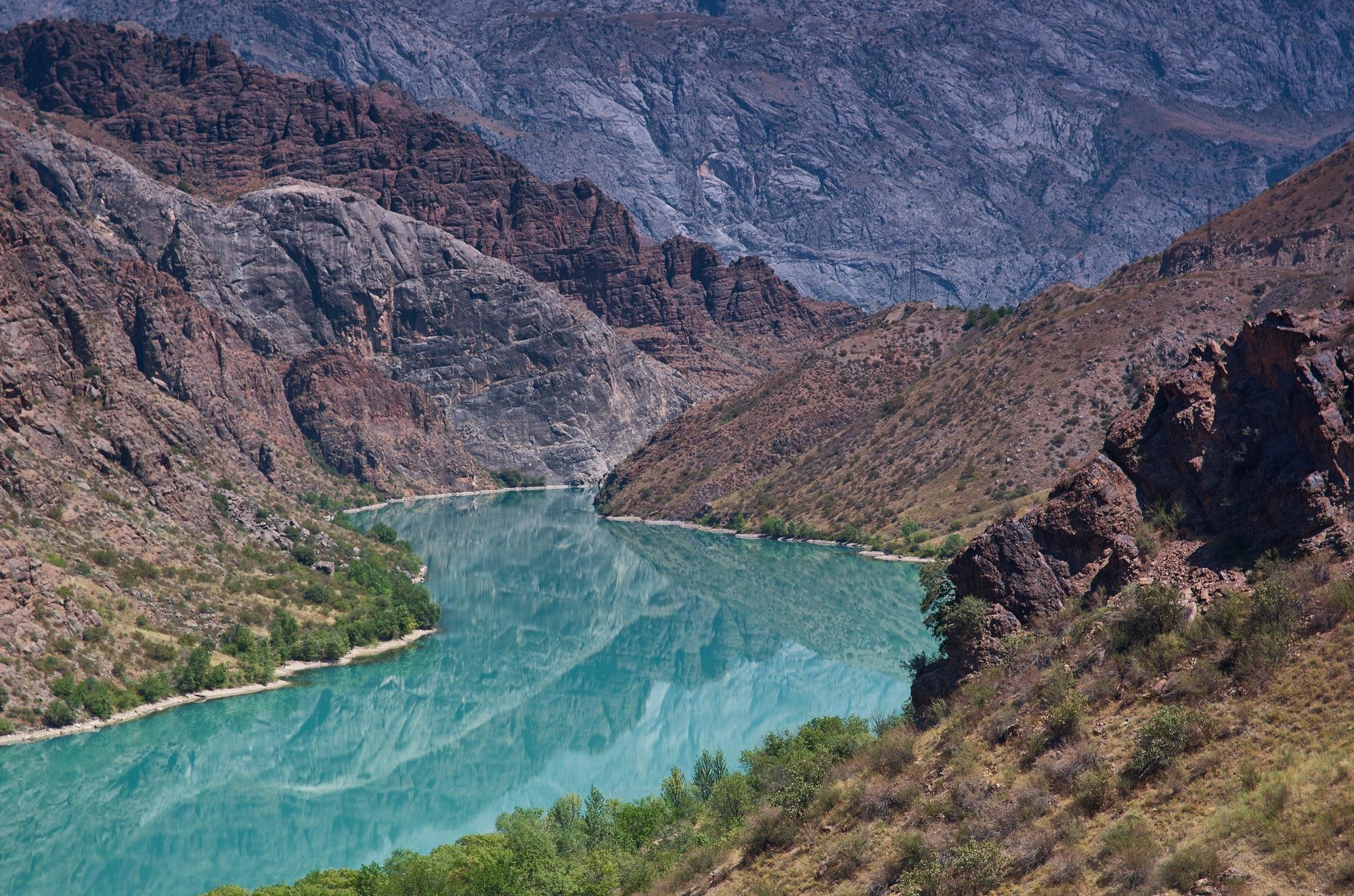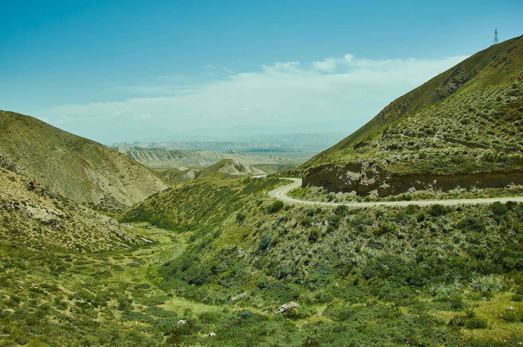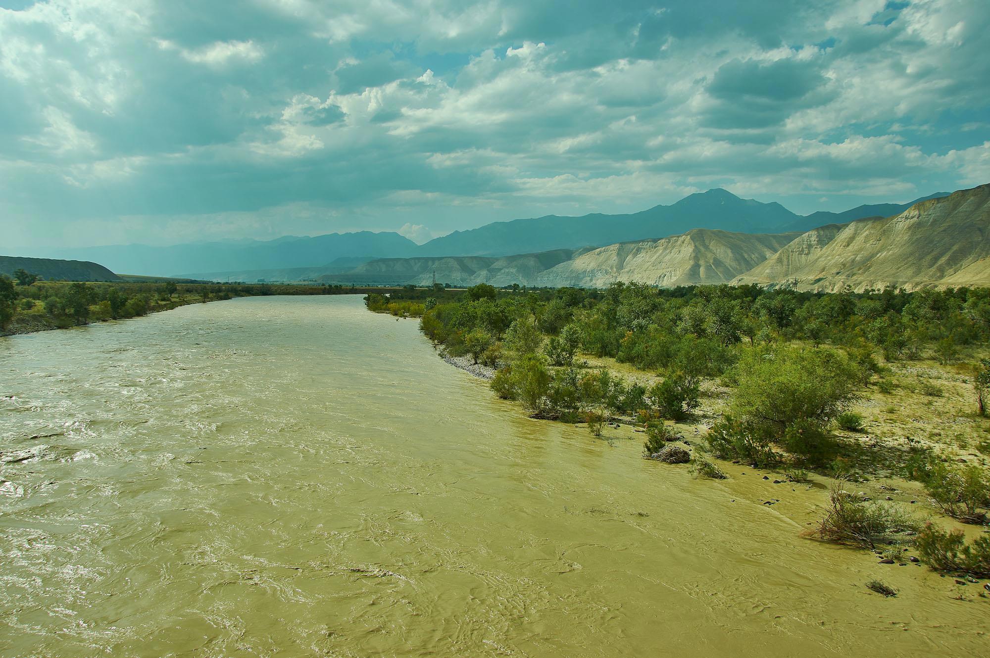 Выжженный солнцем ландшафт. Вот появляется река Нарын. Мутная после дождей, она дает жизнь округе. Вдоль нее видны селения. Она самая многоводная река республики, образованная слиянием рек Большой Нарын и Малый Нарын. Они зарождаются на ледниках Центрального Тянь-Шаня. Общая протяженность реки — 807 километров, а площадь бассейна — 59,9 тысячи квадратных километров