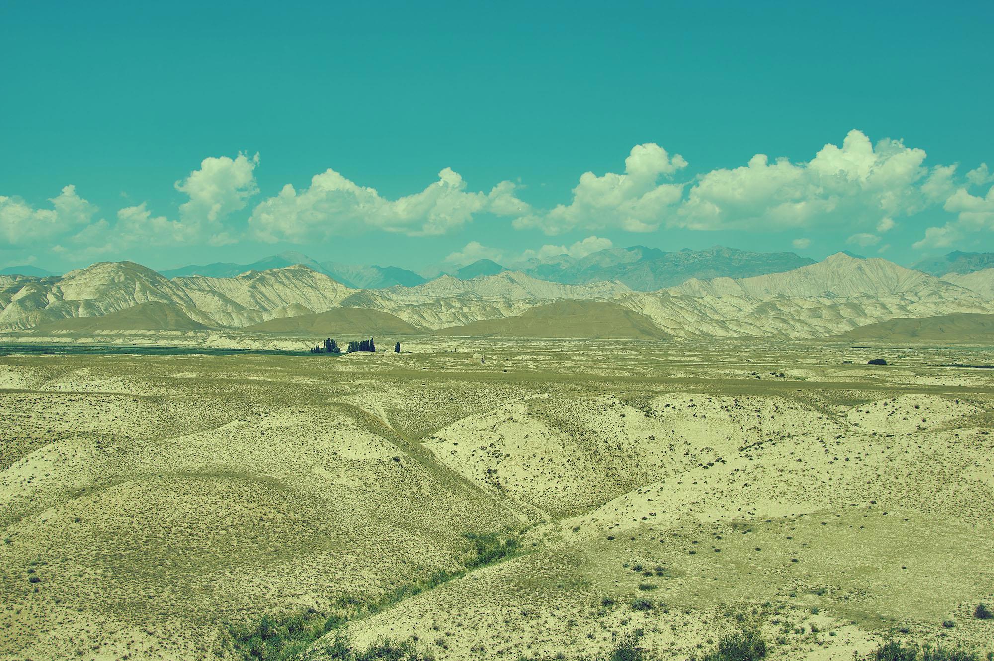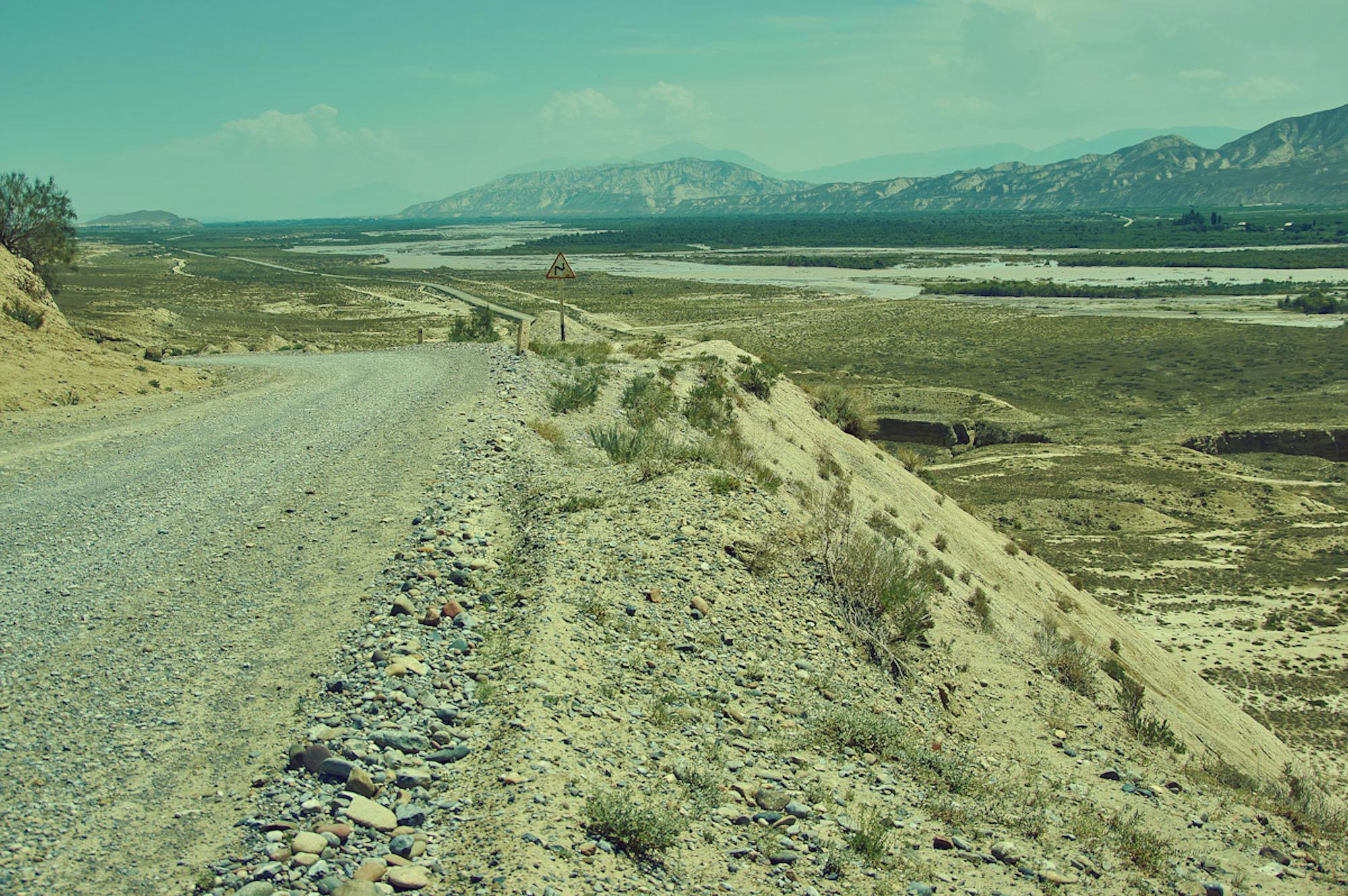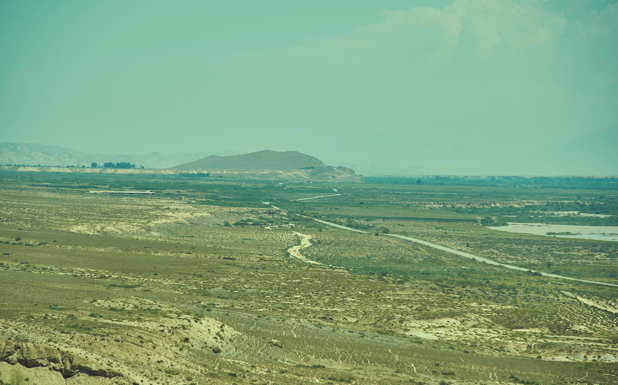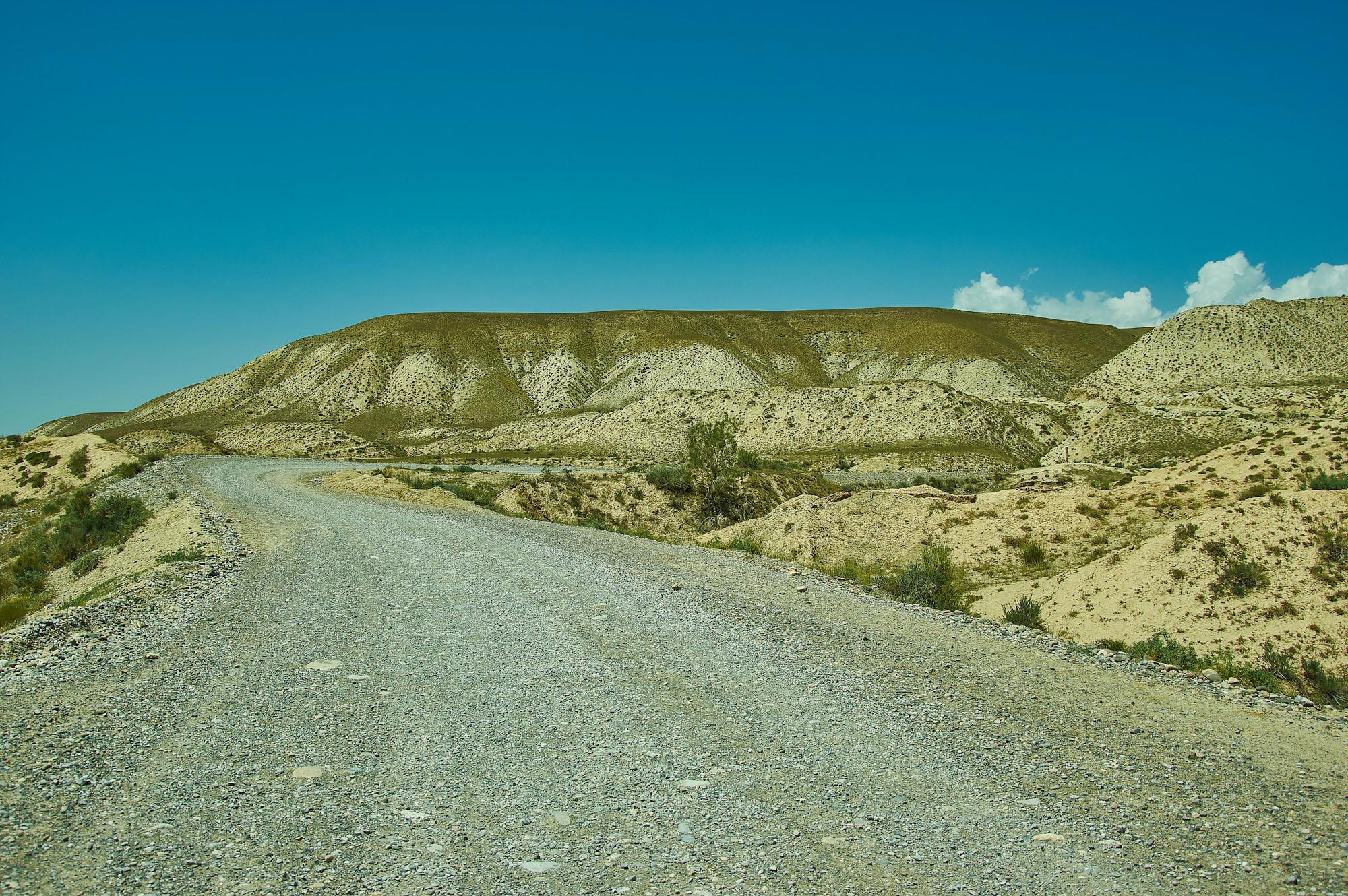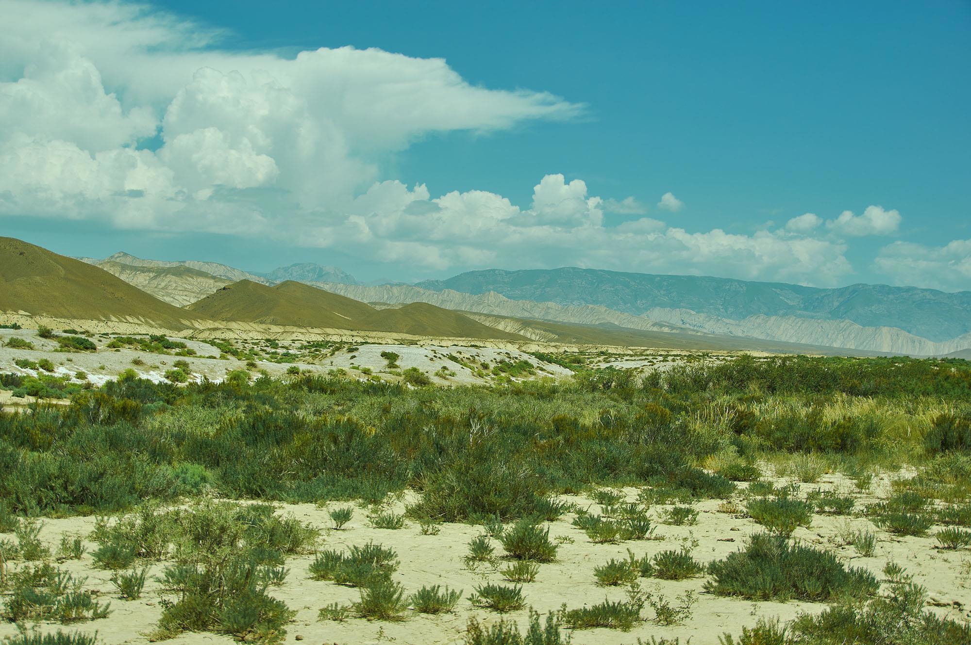 На выходе из узкого ущелья, что был показан в прошлый блог, как будто находится граница между климатическими поясами. Свежесть гор и зелень заканчиваются, начинается пустыня, накатывает жара за тридцать. В этом регионе можно наблюдать несколько природно-климатических зон: на высоте 1400—1600 метров над уровнем моря пустыня, 1600—1800 метров — полупустыня, 1800—2000 метров — степи, 2500—4000 метров — субальпийские и альпийские пояса, выше 4000 метров — зона вечных снегов. И все это мы проехали за день.