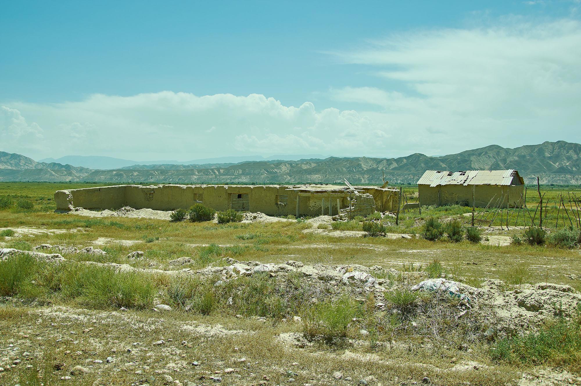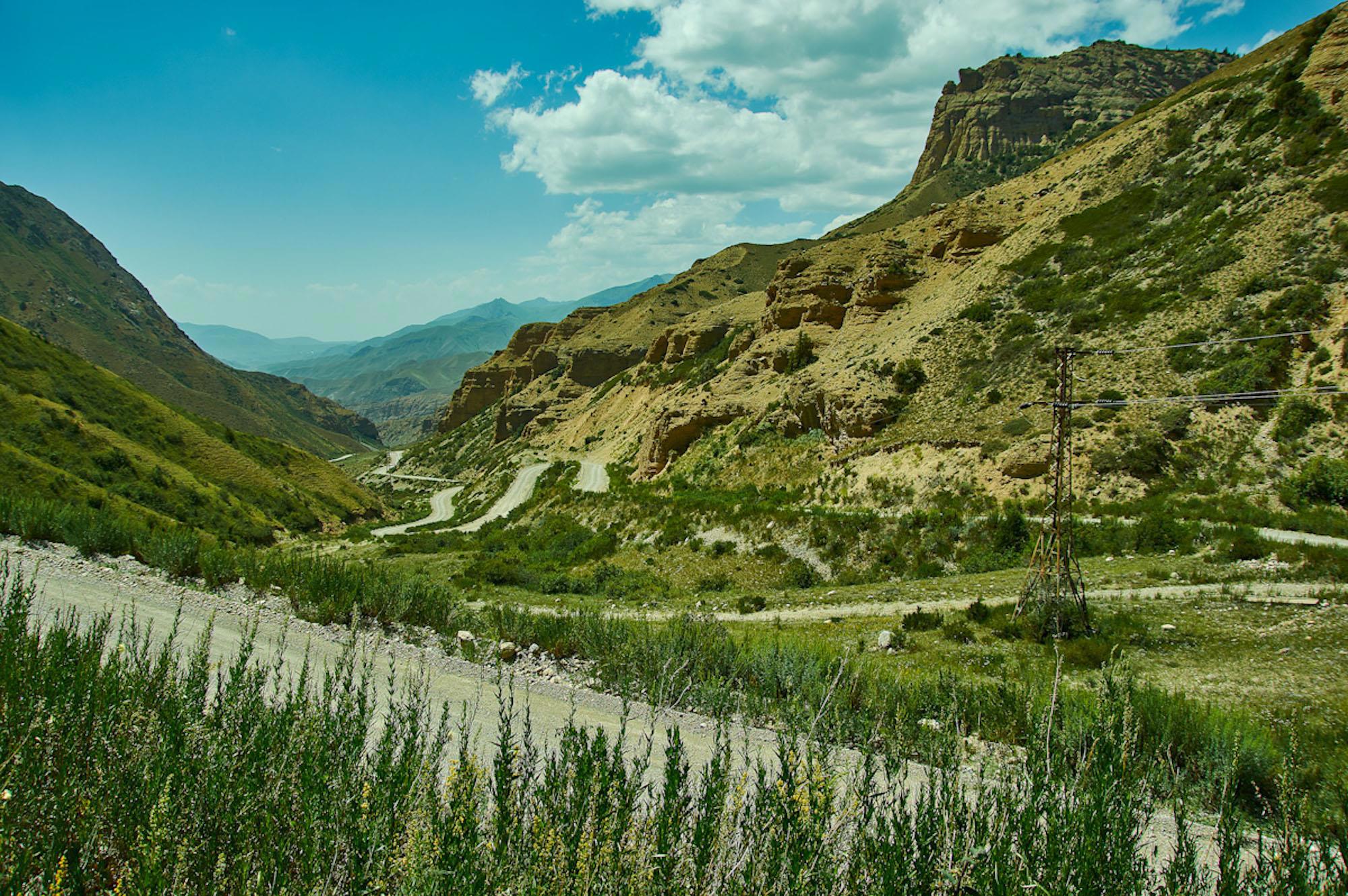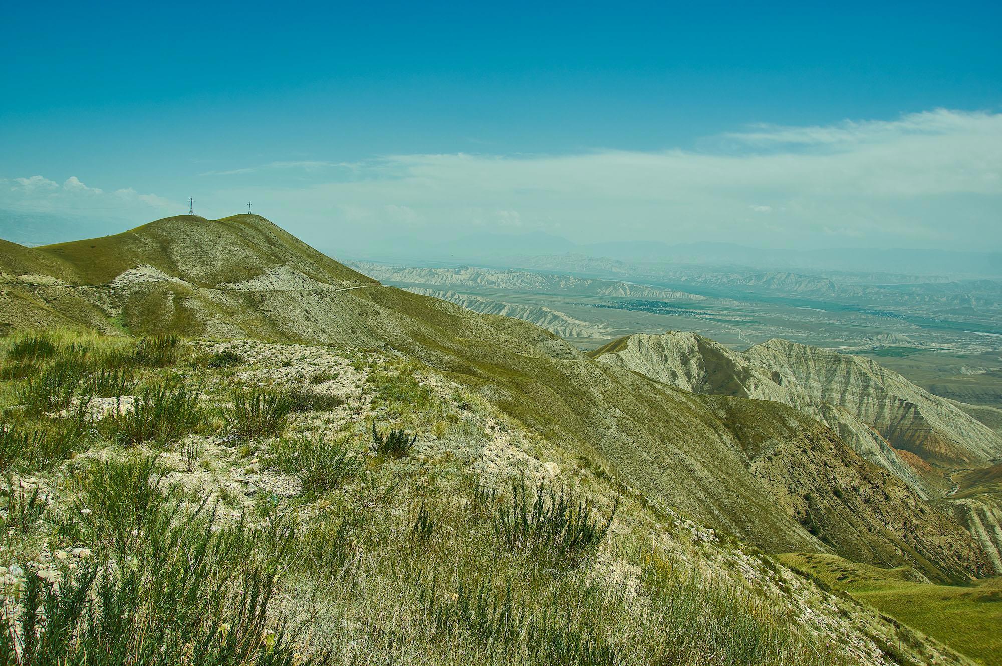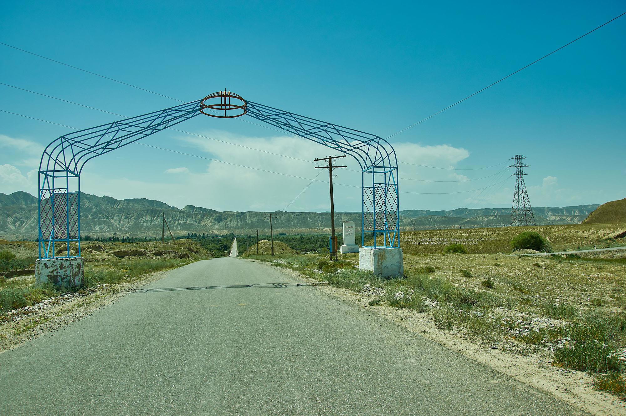 На выходе из узкого ущелья, что был показан в прошлый блог, как будто находится граница между климатическими поясами. Свежесть гор и зелень заканчиваются, начинается пустыня, накатывает жара за тридцать. В этом регионе можно наблюдать несколько природно-климатических зон: на высоте 1400—1600 метров над уровнем моря пустыня, 1600—1800 метров — полупустыня, 1800—2000 метров — степи, 2500—4000 метров — субальпийские и альпийские пояса, выше 4000 метров — зона вечных снегов. И все это мы проехали за день.