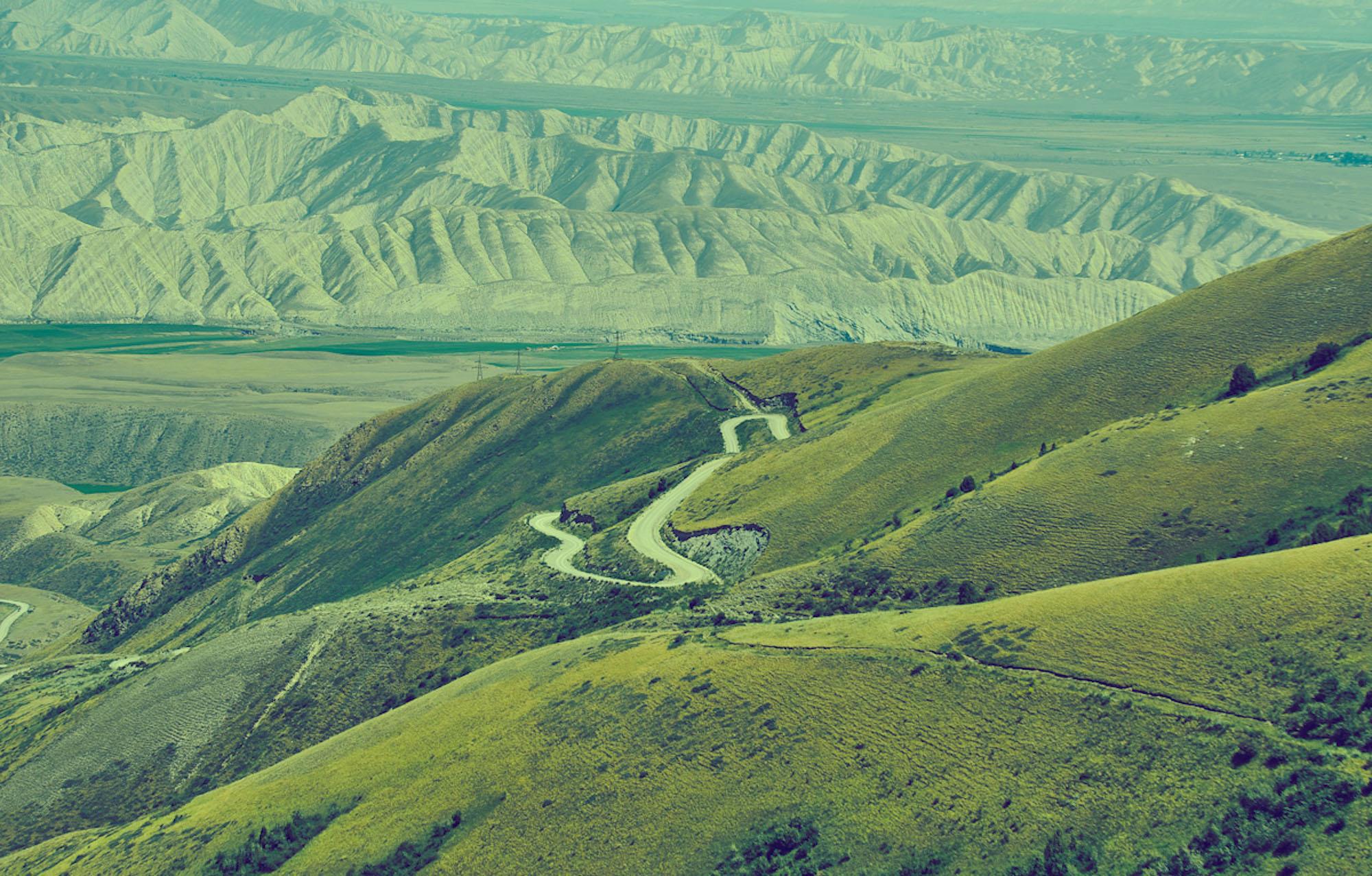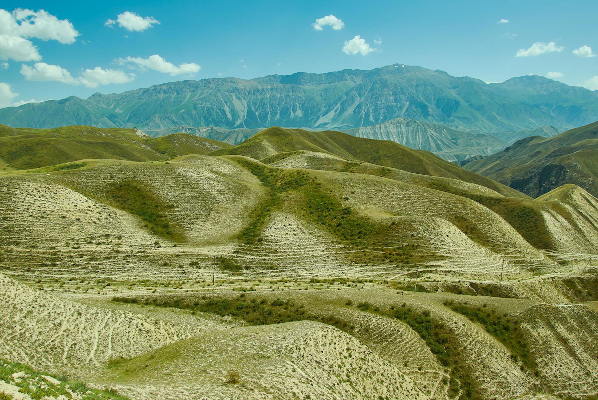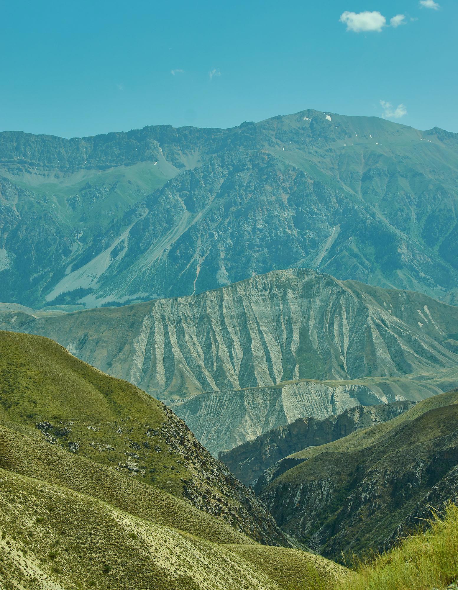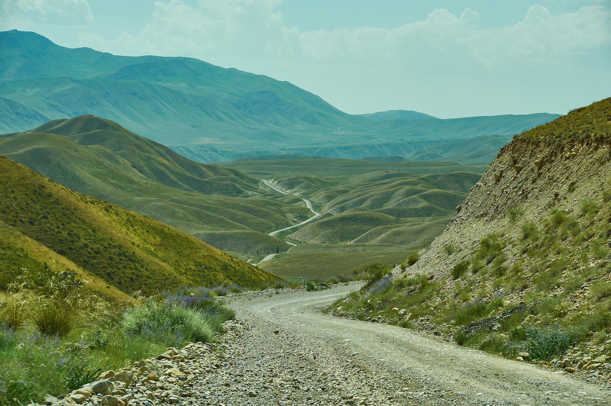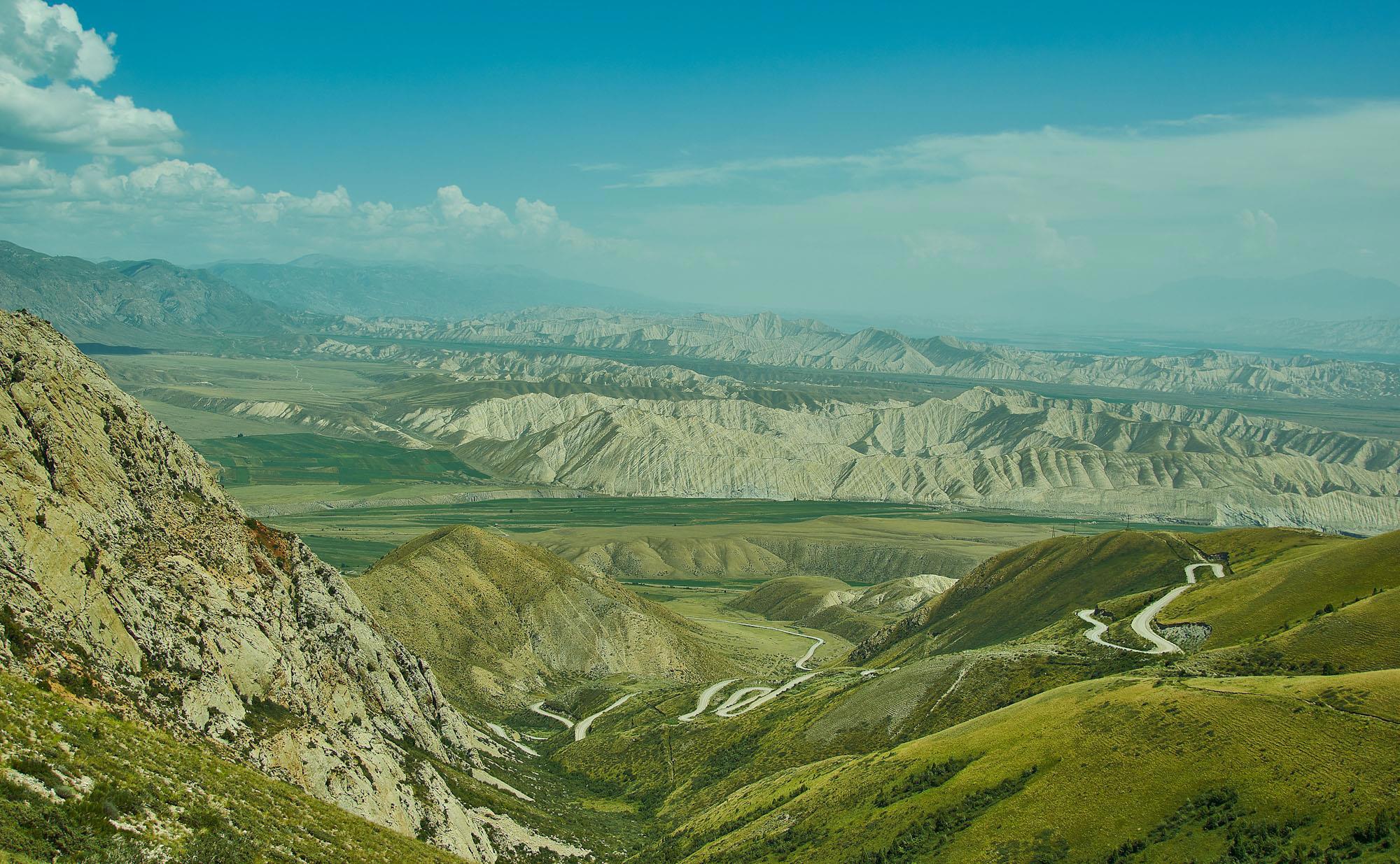 На выходе из узкого ущелья, что был показан в прошлый блог, как будто находится граница между климатическими поясами. Свежесть гор и зелень заканчиваются, начинается пустыня, накатывает жара за тридцать. В этом регионе можно наблюдать несколько природно-климатических зон: на высоте 1400—1600 метров над уровнем моря пустыня, 1600—1800 метров — полупустыня, 1800—2000 метров — степи, 2500—4000 метров — субальпийские и альпийские пояса, выше 4000 метров — зона вечных снегов. И все это мы проехали за день.