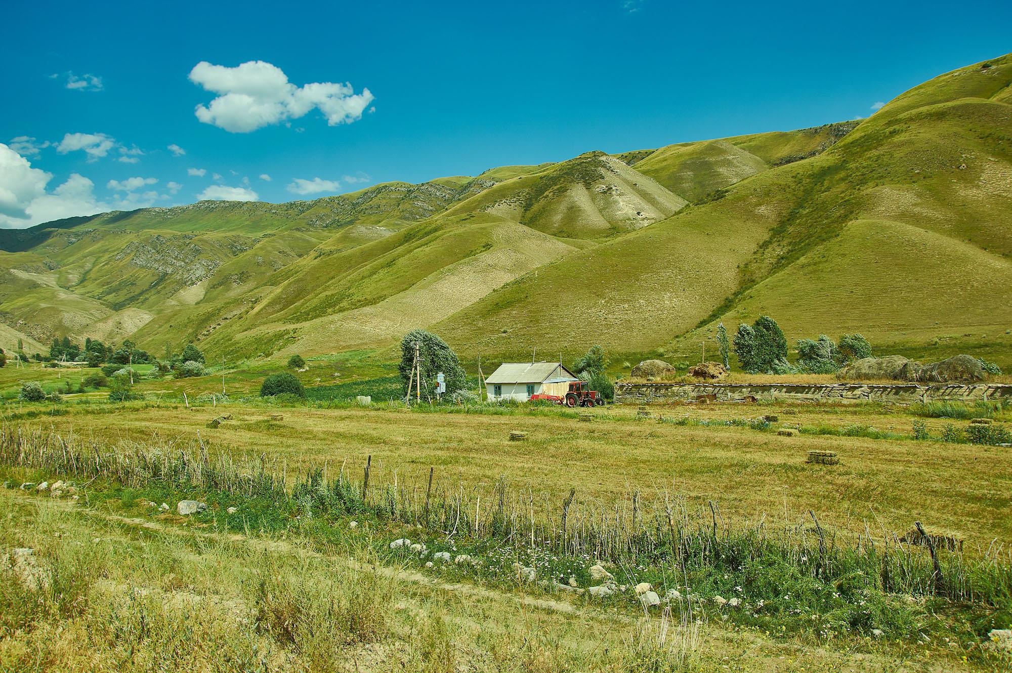Дорога и дальше идет между безумно красивых гор на любой вкус. Появились дома и поля. Сено люди косят.