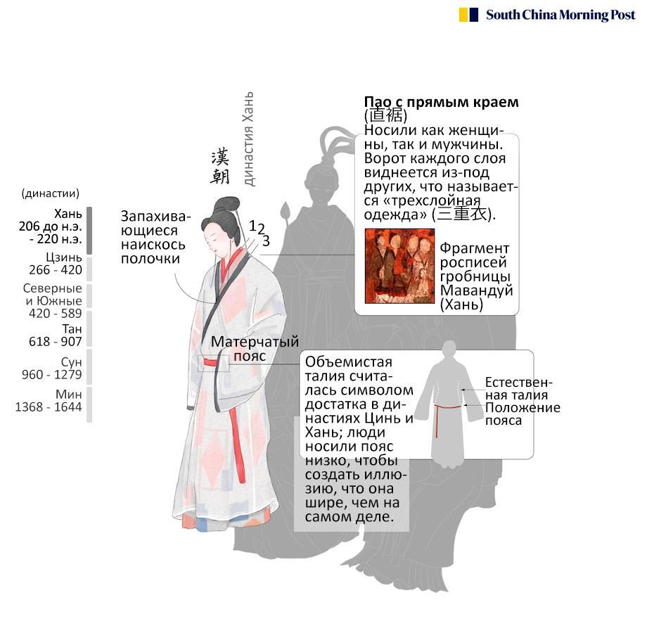Объемистая талия считалась символом достатка в династиях Цинь и Хань; люди носили пояс низко, чтобы создать иллюзию, что она шире, чем на самом деле.