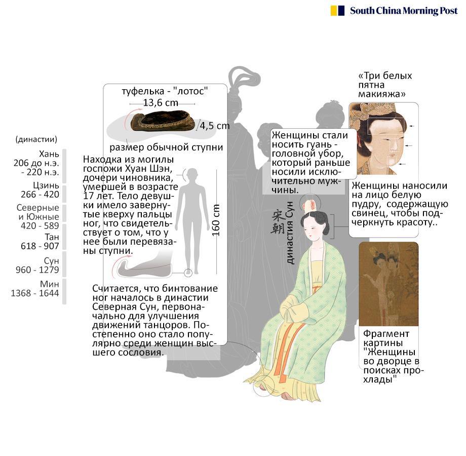 Считается, что бинтование ног началось в династии Северная Сун, первоначально для улучшения движений танцоров. Постепенно оно стало популярно среди женщин высшего сословия.