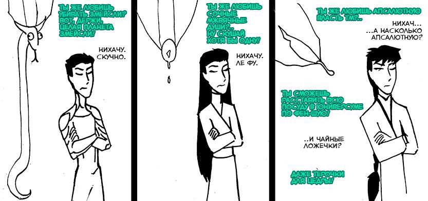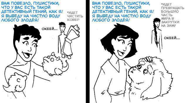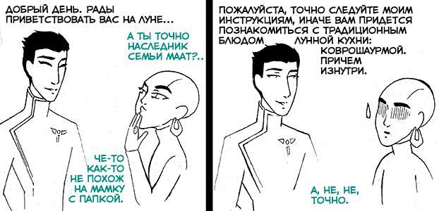 Если вы узнали всех действующих лиц (а то и некоторые сцены), то, вероятно, уже читали "Три нити", или "Три колеса", или даже "Space Oddity". Если вы читали вообще все, мой респект вам и авторская благодарность! А если не читали ничего, надеюсь, картинки вас все равно повеселили (но с контекстом они смешнее, гарантирую))