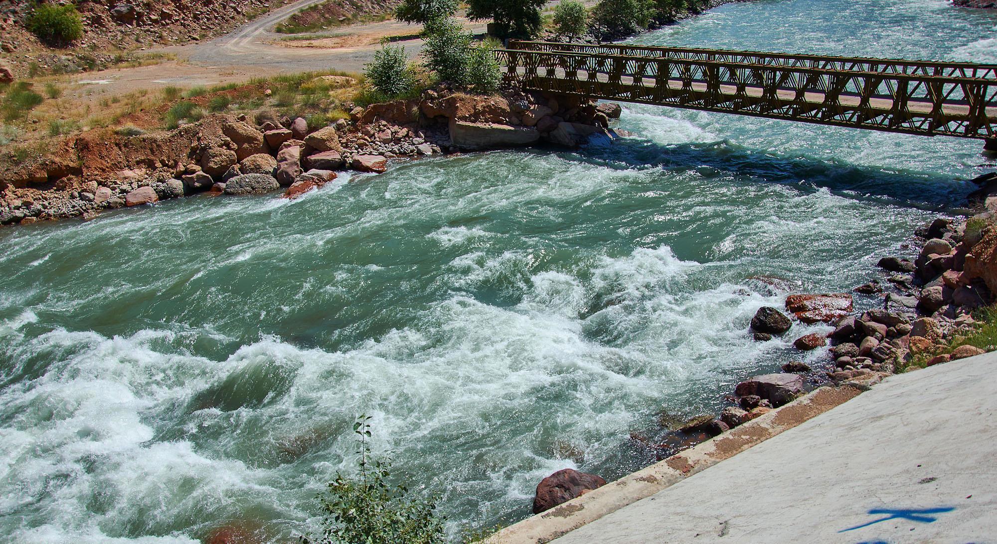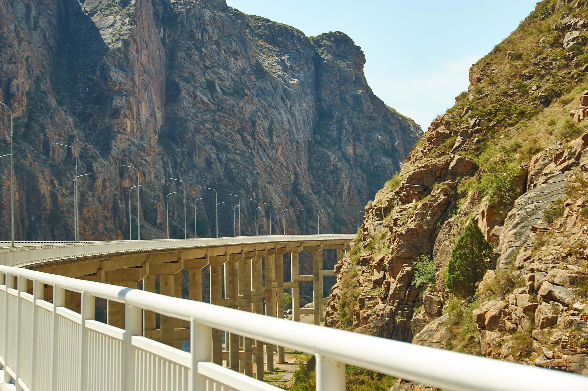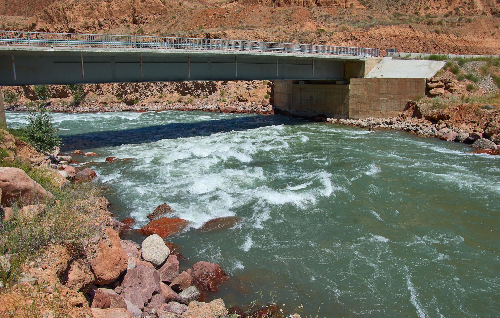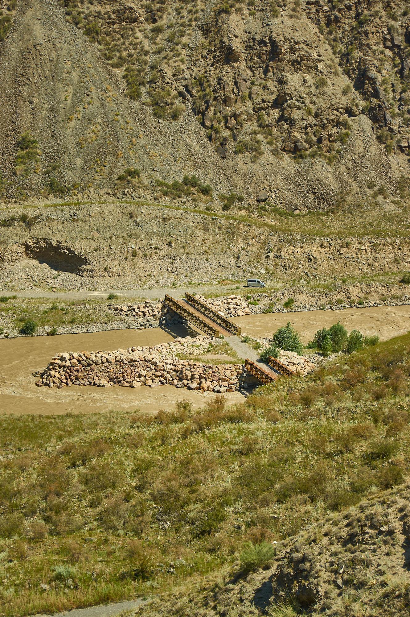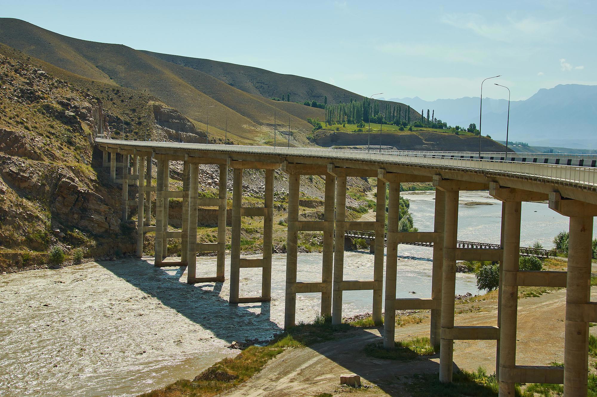 Рискнем! В крайнем случае остается старый путь через горы. Успеем! Авантюристы они такие. Плывут до Америки, потом ее открывают.  Выкатываем из города и резко попадаем на огромный километровый мост через реку Нарын.