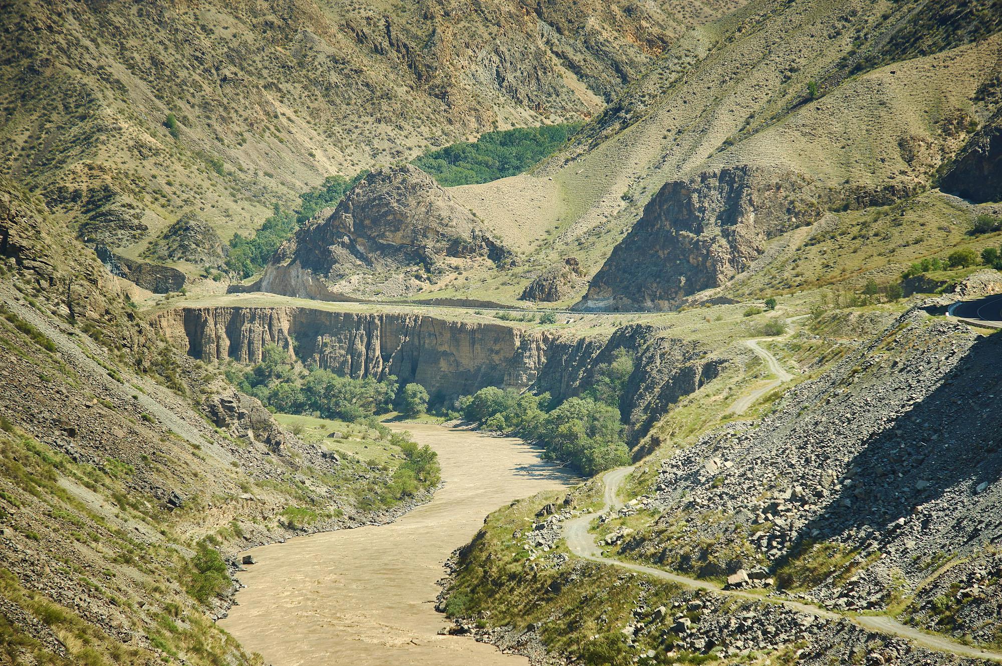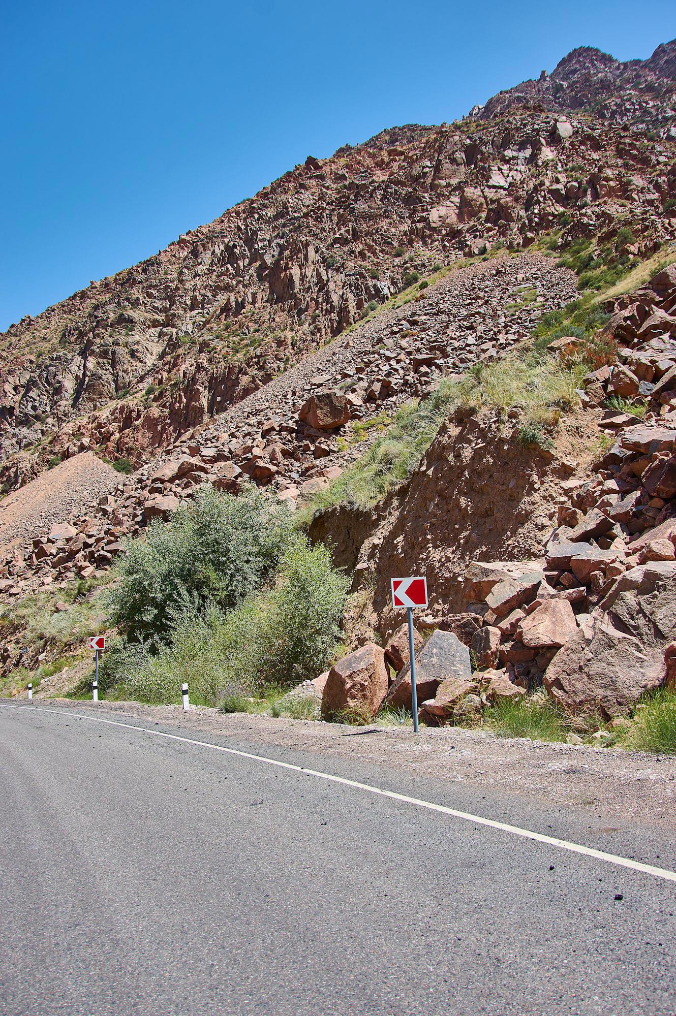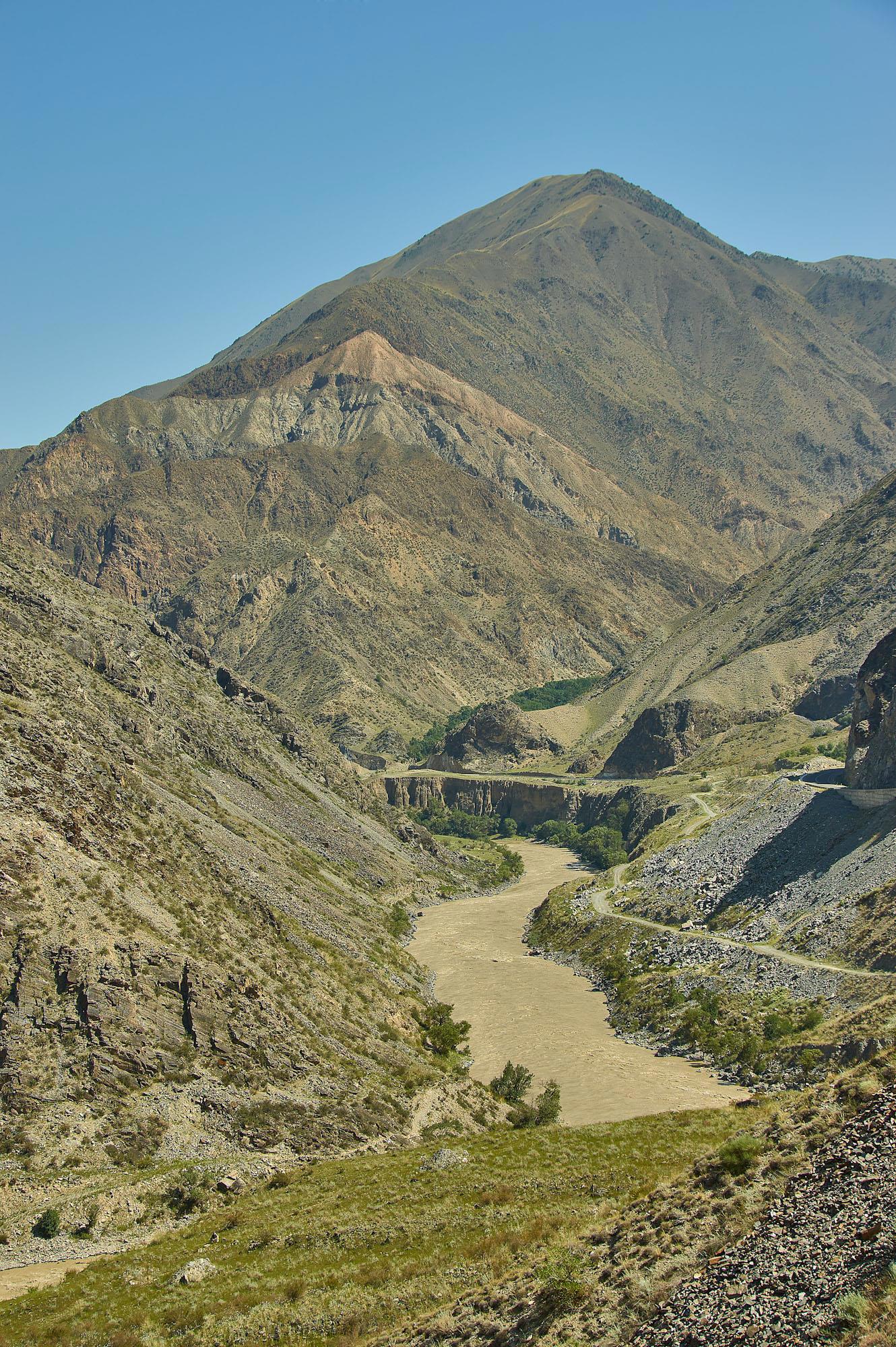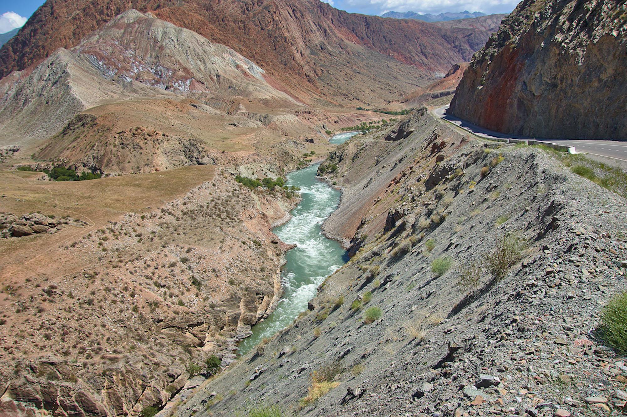 Трасса виляет вдоль Нарына. Мутный поток далеко внизу. Вокруг скалы и гигантские оползни.