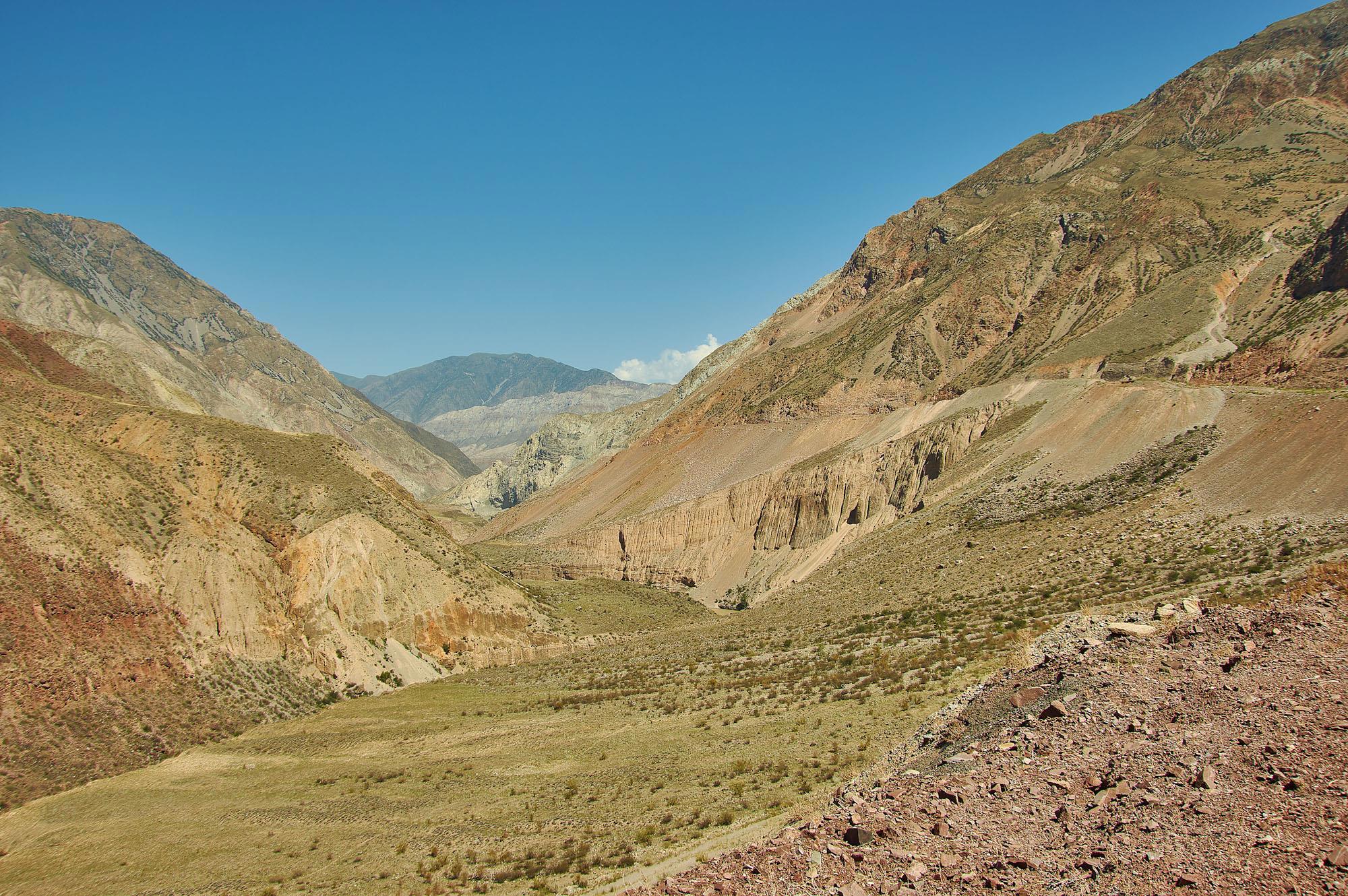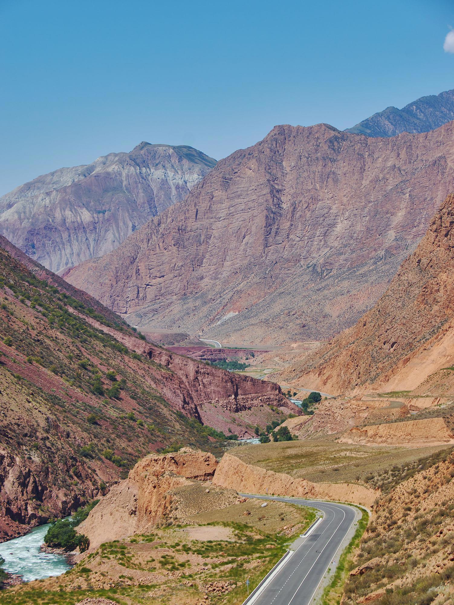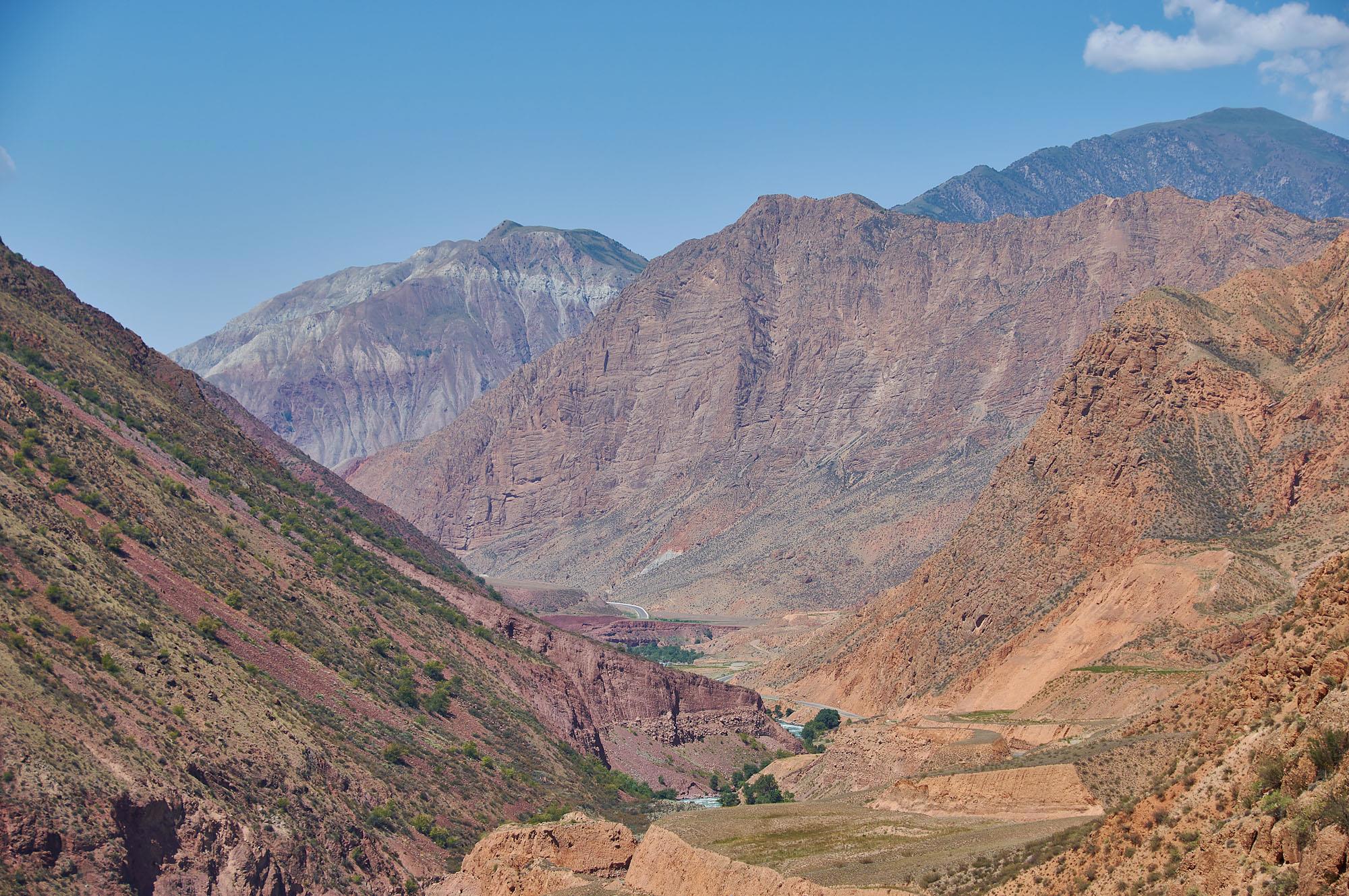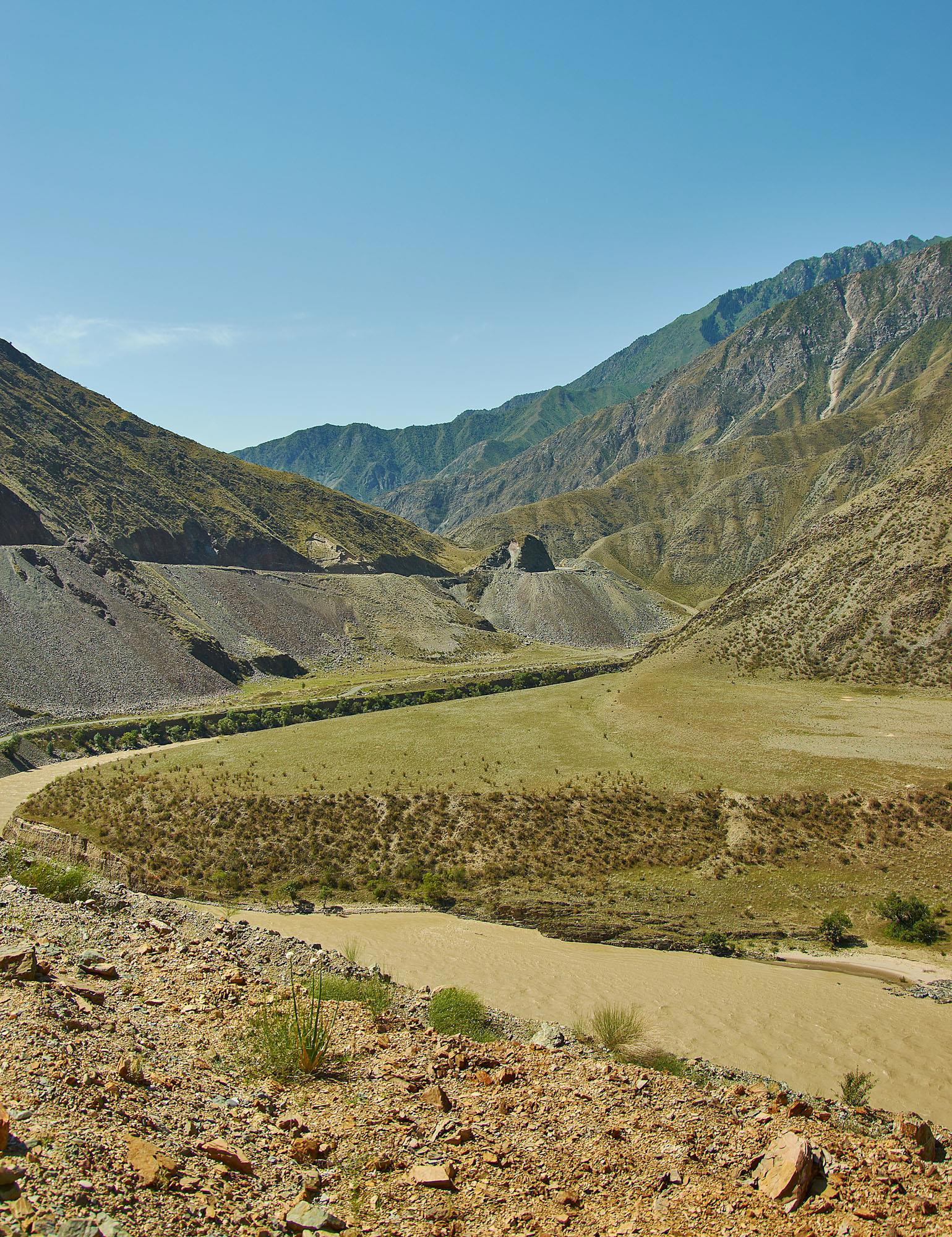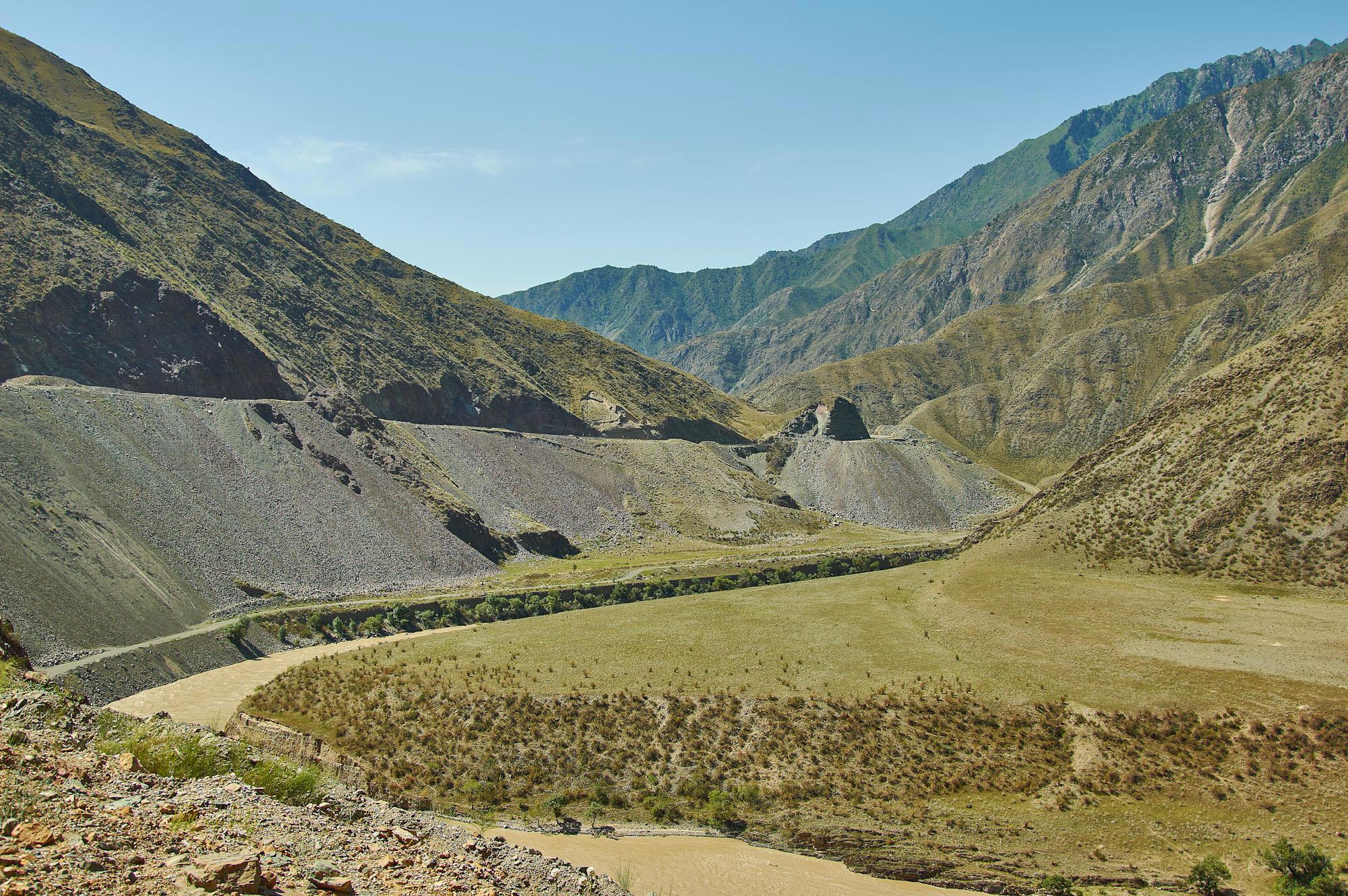 Трасса виляет вдоль Нарына. Мутный поток далеко внизу. Вокруг скалы и гигантские оползни.