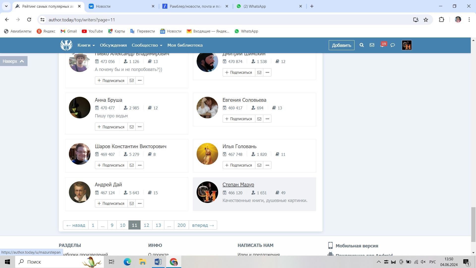 Во-вторых, бесконечное творчество и ваша поддержка приносят плоды: расту в рейтинге. Вчера взобрался на 11 страницу, а это значит, что попал в топ-550. (на каждой странице по 50 человек).