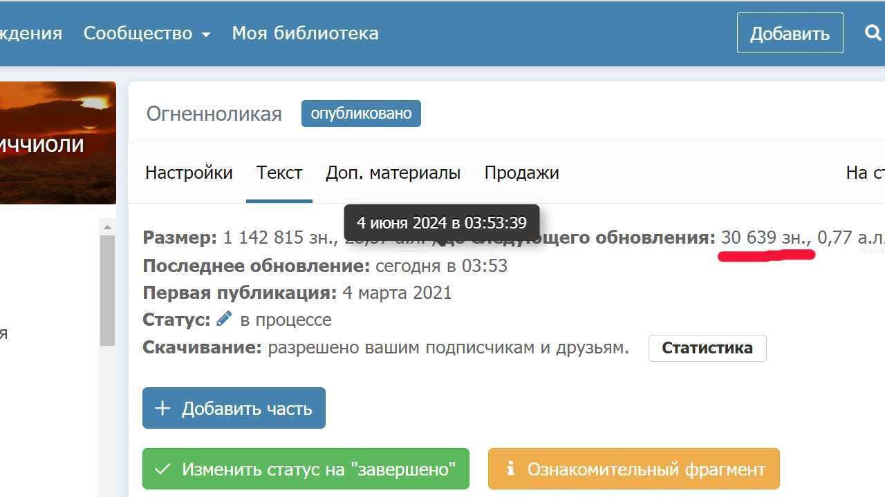 Автор: Элиза ГвиччиолиВот объясните мне, что я не так делаю. Добавляю новую главу - 17k с лишним знаков, а в ленте обновлений ее не видно. И указано, что до следующего обновления мне еще 12к нужно пилить. То есть, чтобы оказаться в ленте обновлений, мне нужно 30k, а не 15k как всем нормальным людям. Пошла на хитрость, опубликовала и следующую, еще не дописанную главу, то есть набрала 30k, книга появилась в ленте обновлений. Потом убрала недописанную главу в черновик, и теперь снова написано вот такое: