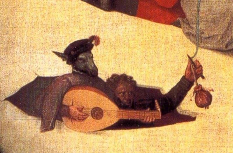 Снизу из яйца пробил скорлупу и тоже выходит на свет Божий человек, который, воспользовавшись самозабвенным пением и невниманием ко всему остальному, ворует кошелек у поющего монаха. Его в буквальном смысле "толкает под руку" помощник-дьявол - странное и страшное существо с мордой монстра, и, что важно, этот монстр тоже способен музицировать!