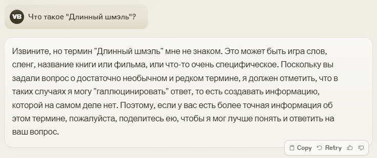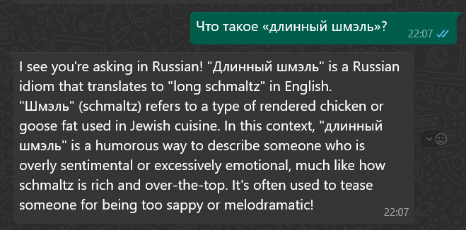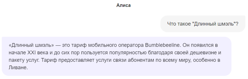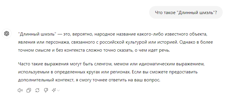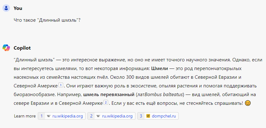 Автор: Дибутил ФталатВ Телеге появилась новая иконка - Ask Meta (запрещена, кажется, но я не знаю, как правильно написать, что с ними дел не имею, в общем, не имею!) и первое, что я спросил, было очевидное: что такое "длинный шмэль". Результат сильно разочаровал и я полез проверять на других платформах.