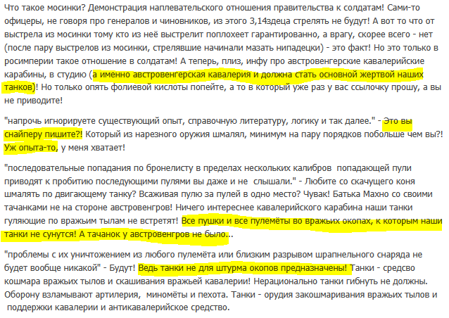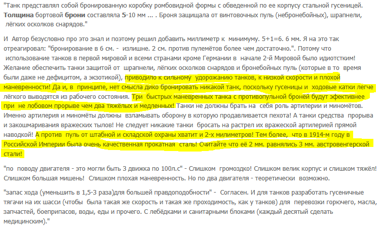 Короче пирдуха заключается в том, что впопуданцы изобретают легкие танки-танкетки, которые, прям как ызарги у Камши кишмя-кишат, флангово забегают, едут быстро, далеко и надолго, пушто у них по два стосильных движка, броня в 2 мм (потому что импортозамещение и российская катаная броня в 2 мм лучше 3 мм австрийской, а значит ее достаточно, ибо нехер танкам под пушки и пулеметы подставляться, а карабин австро-венгерский не пробьет и ващще). Идея использования танков для прорыва укрепленных позиций отметается как неорганизованная, потому как танки прорыва это дорого и бесполезно, а вот орды танкеток…
