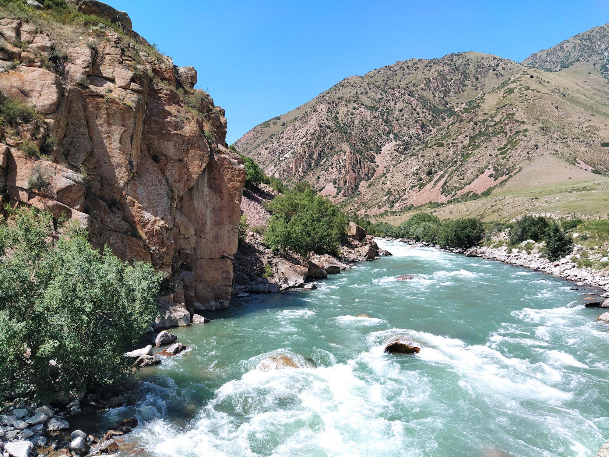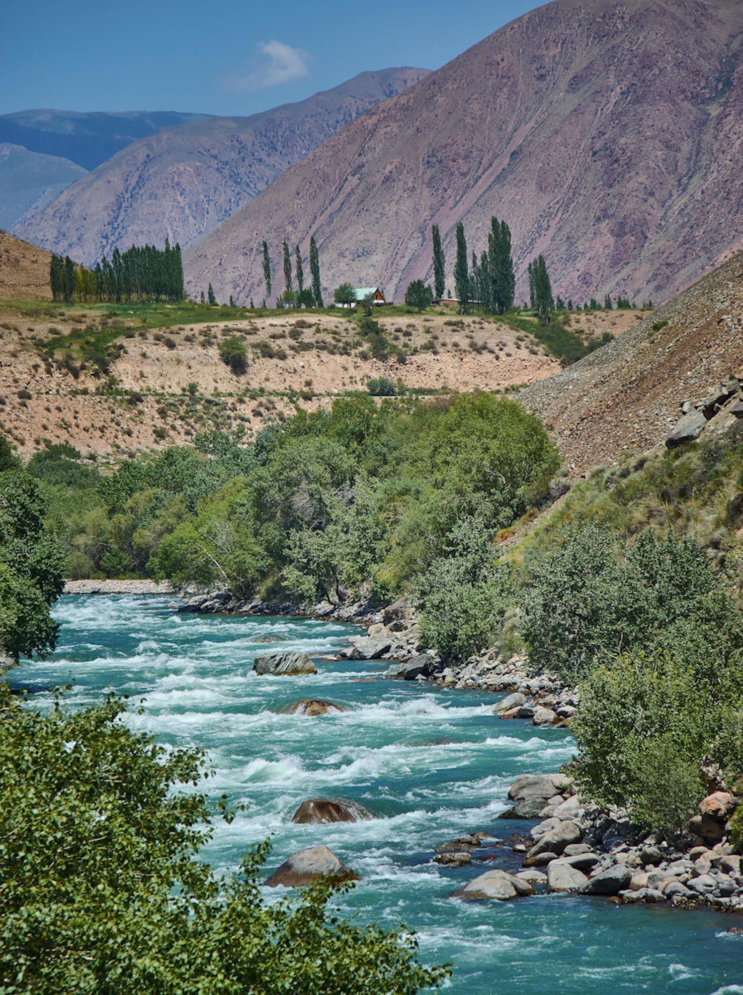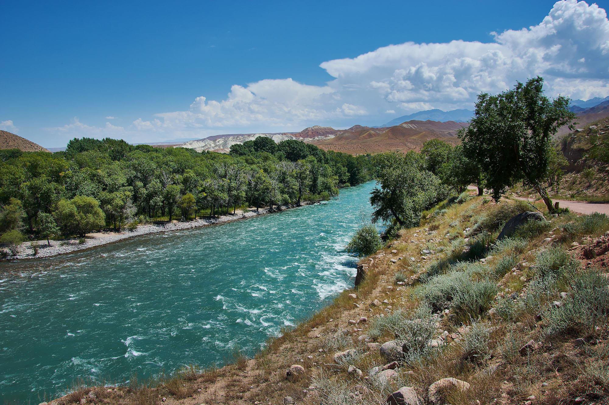 После поворот на север мы до конца дня так и будем ехать вдоль реки Kekemeren. Горы немного расступились в стороны, вдоль реки растут деревья. Мы остановились на привал, чтобы перекусить.