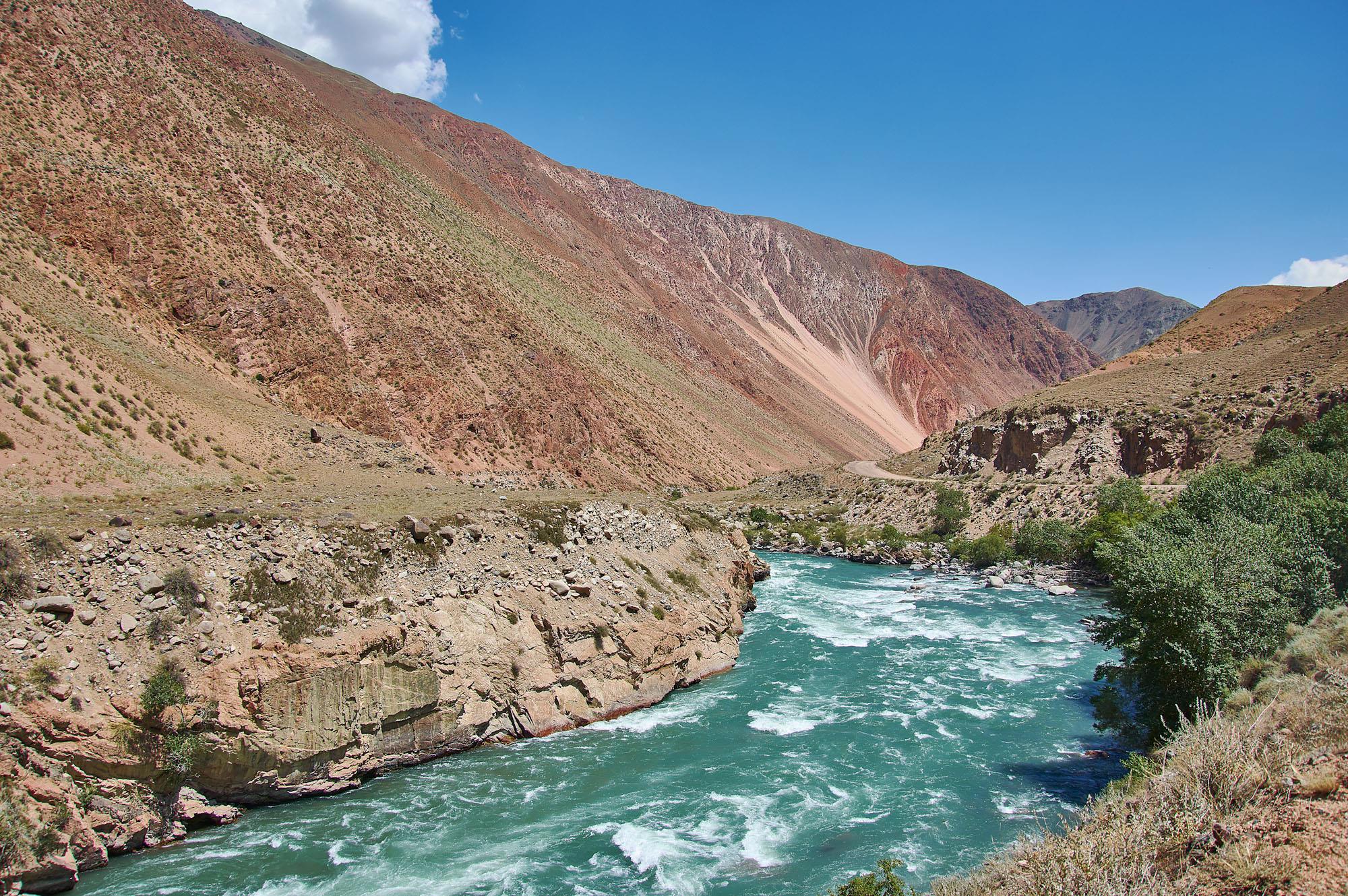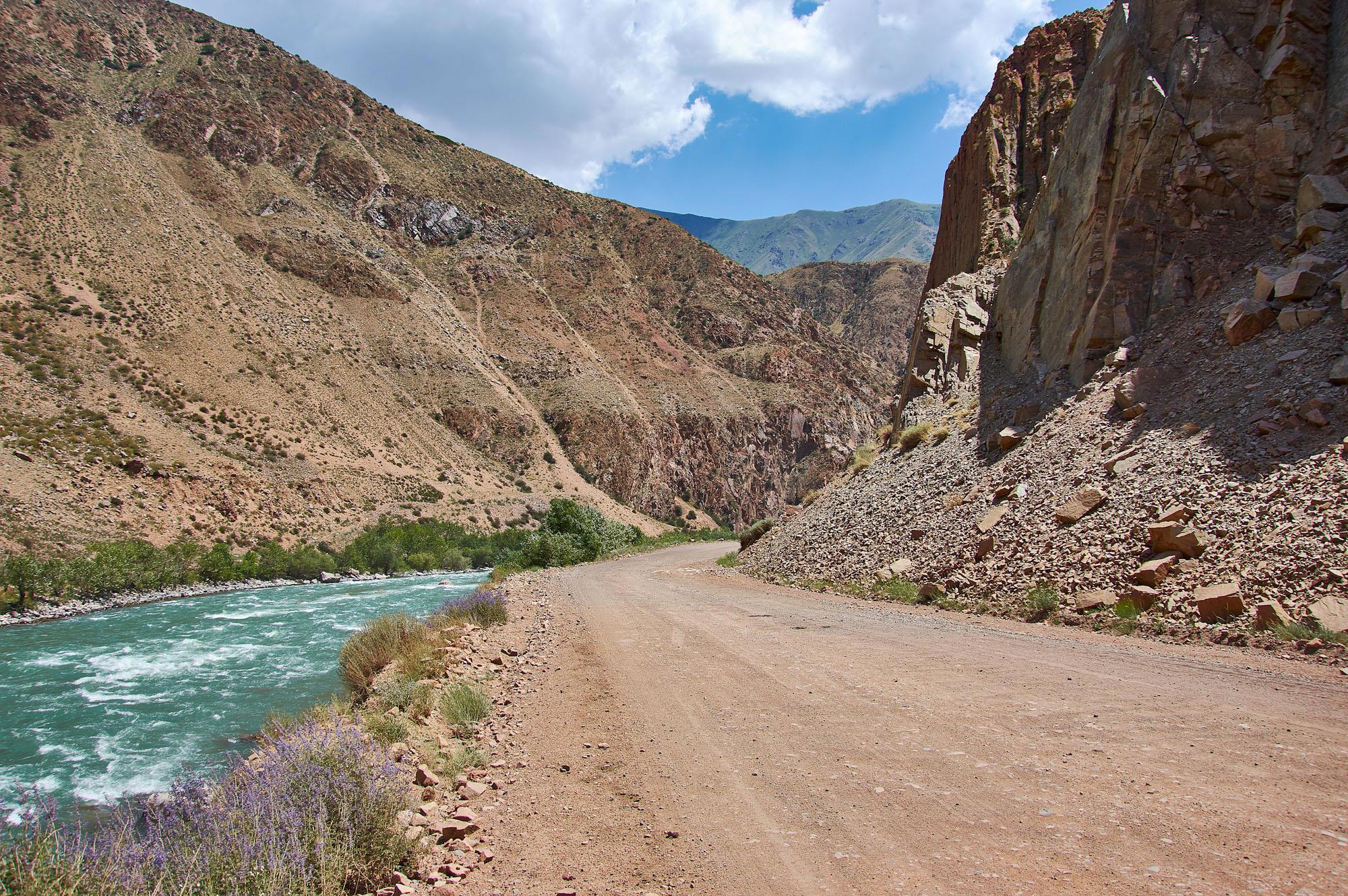 Красота скрашивает тяжесть дороги. Скорость относительно низкая. Дорога местами суживается, приходится объезжать камни. Но вполне проходимая по киргизским меркам.