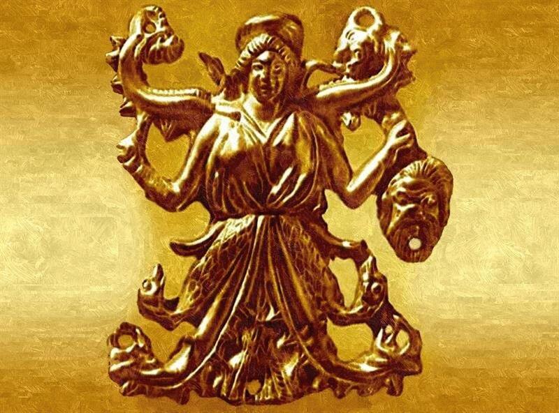 Богиня Апи в калафе. Золотая бляшка из кургана Куль-Оба.