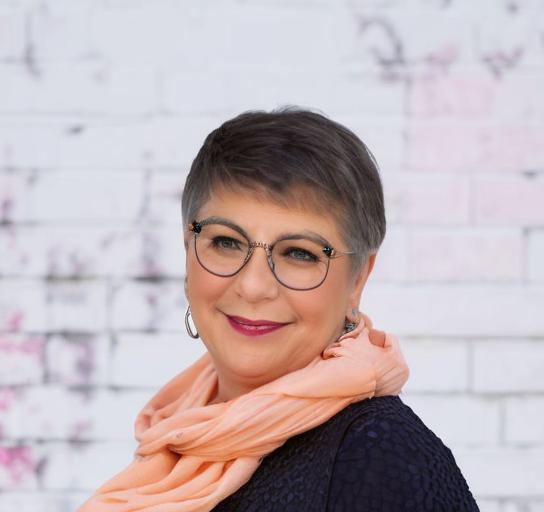 А улыбаться она любит. И носит очки (от дальнозоркости). И коротко стрижётся.
