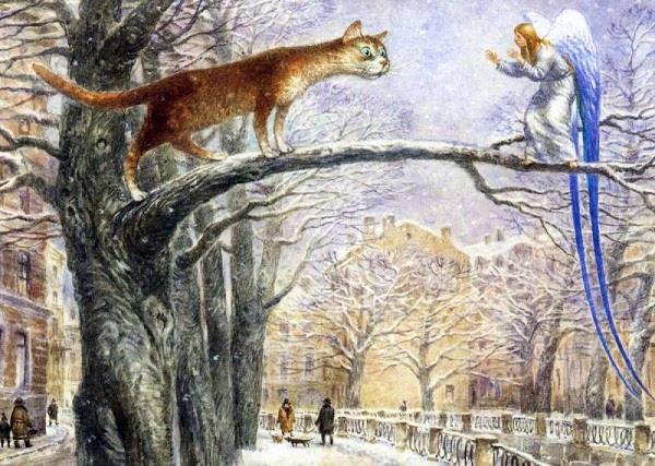 К чему я это... Недавно вспомнился стих, написанный по картине Владимира Румянцева, известного своими неожиданными котами в неожиданных ситуациях. Когда мне прислали эту картинку, я невольно улыбалась, разглядывая её. И вроде в сердце  тихая радость... Но пошёл тот самый стих, и я потом долго хлопала глазами, не понимая, как могло такое появиться от светлой и улыбательной картинки.