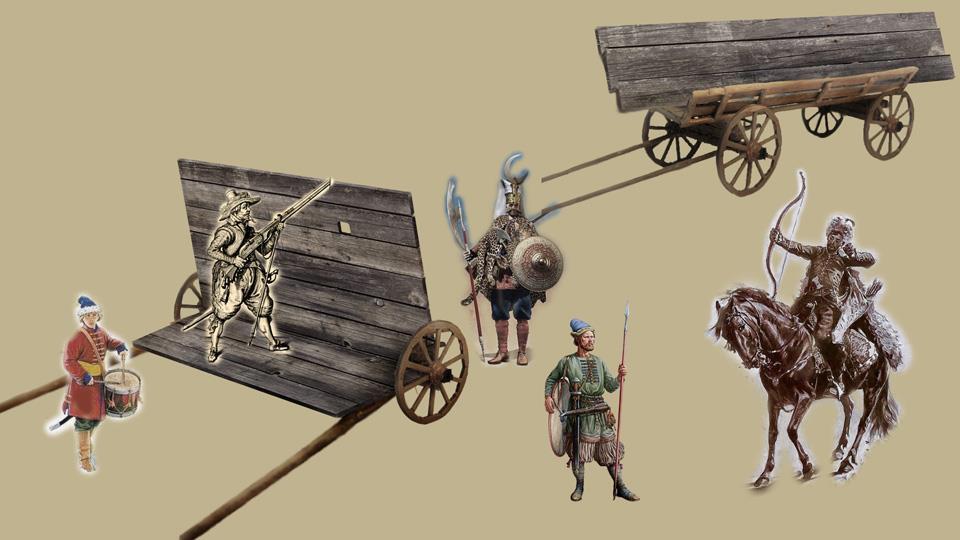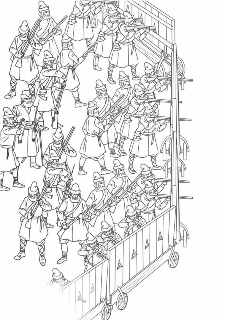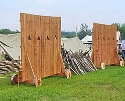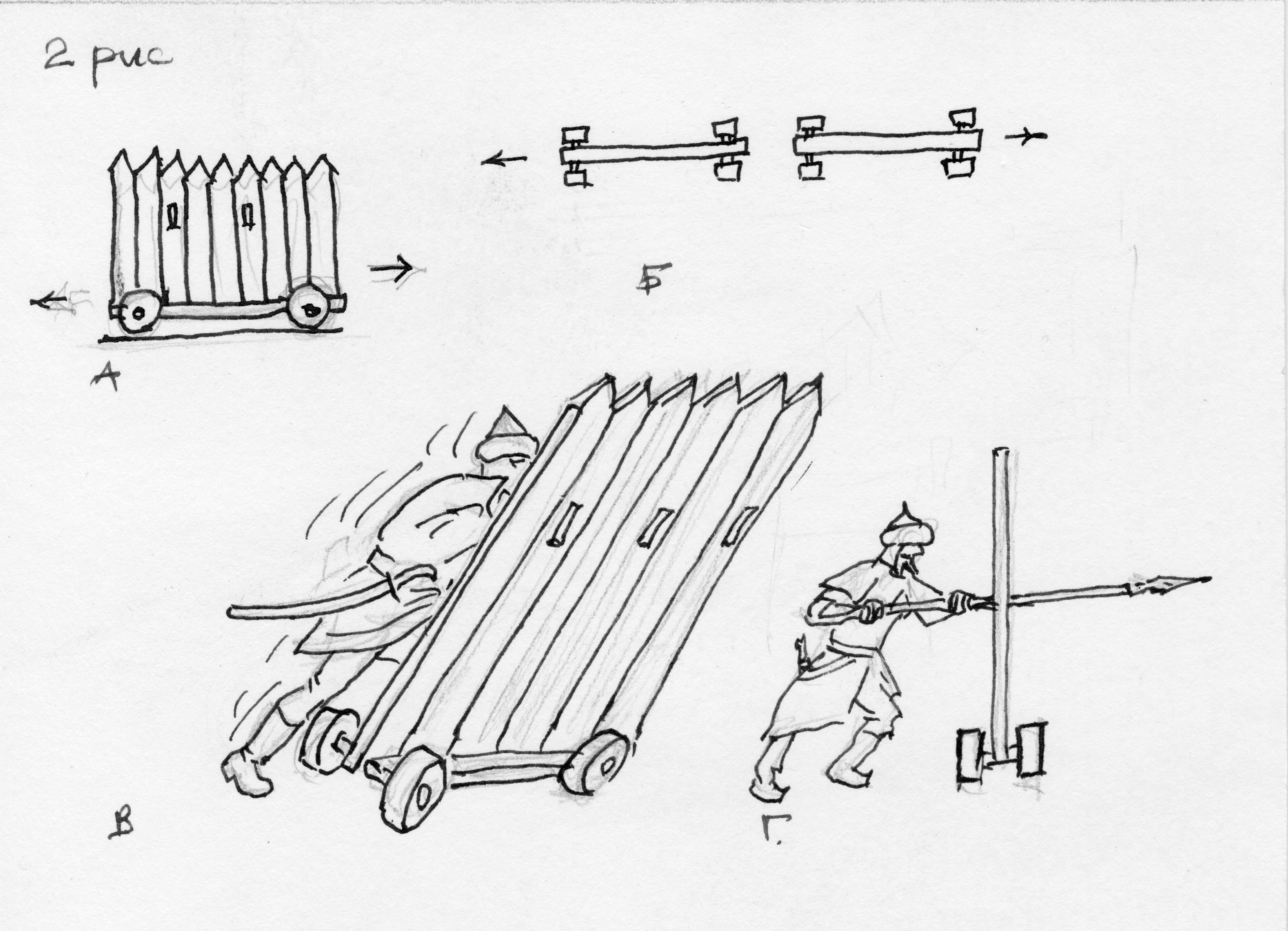 Не знаю с чьей легкой руки но элементы гуляй города почему-то практически везде представлены в виде намертво сколоченных щитов на нелепых маленьких колесиках. При том, что вообще-то гуляй-город был конструктором для взрослых мальчиков и собирался в разных вариациях быстро и без таких могучих гвоздей как на картинке. Напомню - тогда железо очень дорого и мастеров по дереву было много.