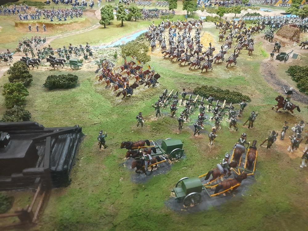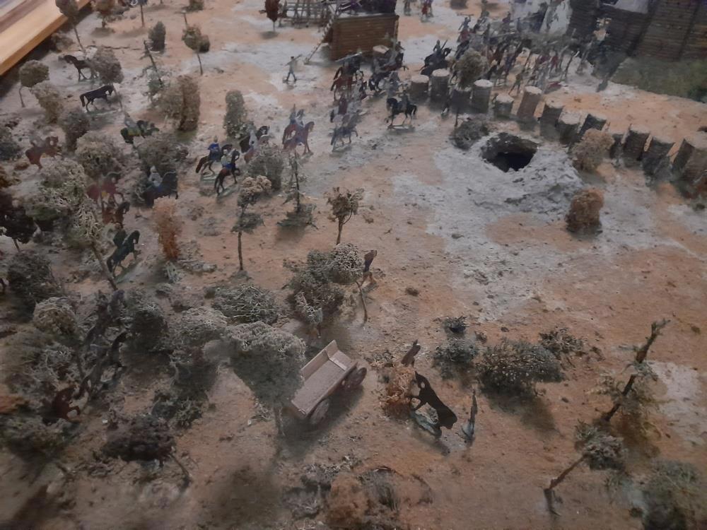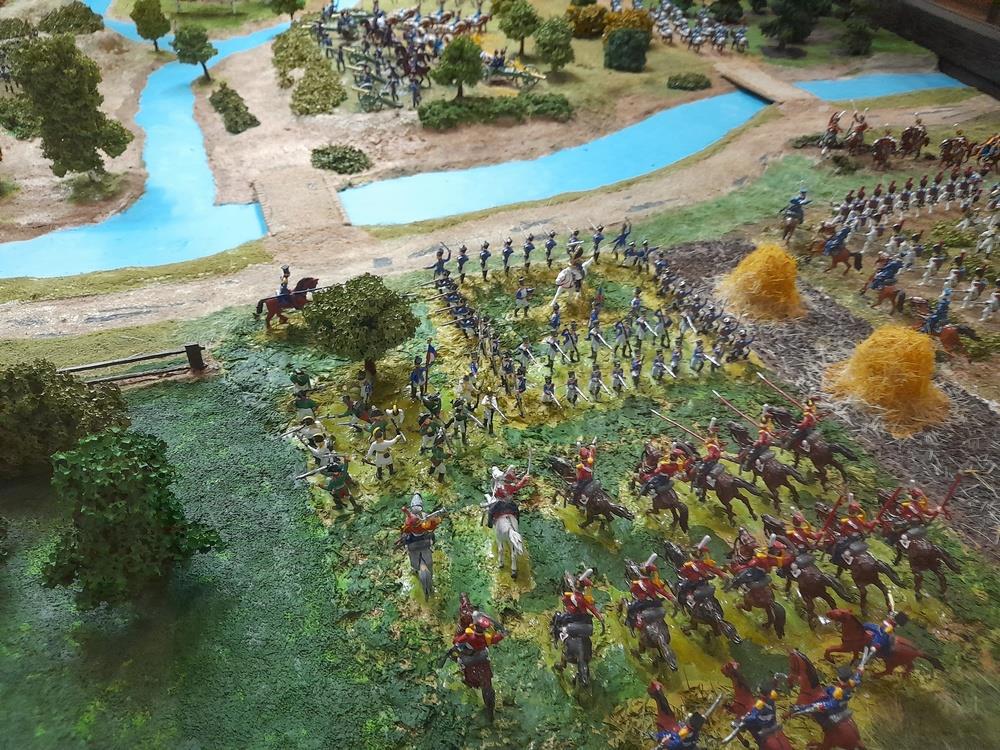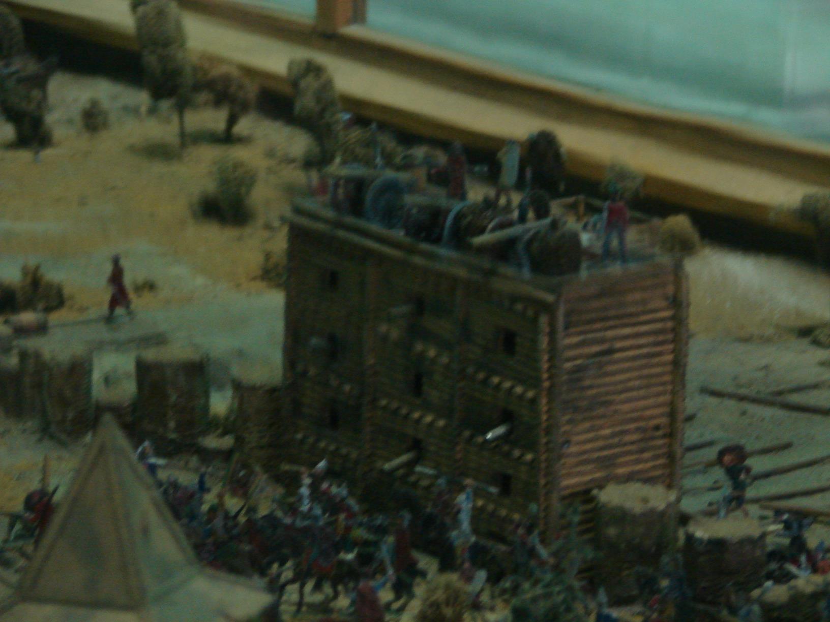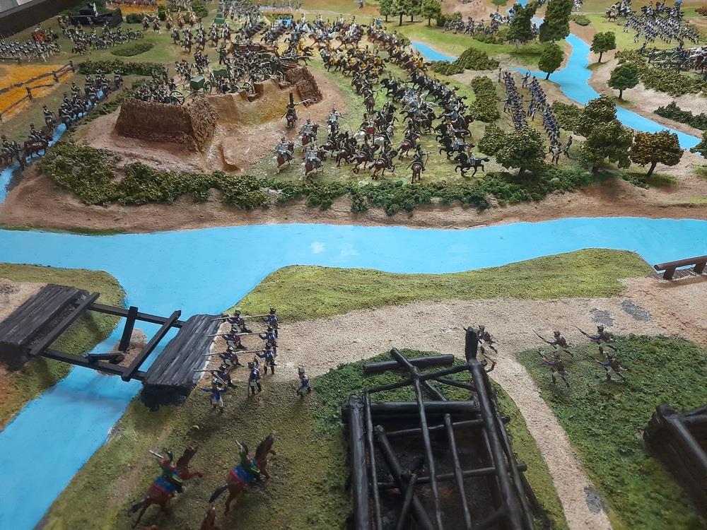 Полк левой руки штурмует пролом в стене после подрыва ее пороховой миной. Как ни старался - бликовало стекло лихо и точка съемки получалась не выигрышной - солдатики плоские, потому тут видны плохо. Но вообще каждый солдатик - старательно индивидуально покрашен. Они все разные на макете. Что всегда внушало - инженерная составляющая вполне на высоте показана, особенно учитывая, что это середина прошлого века, когда таких макетов было очень не густо. А тут и защитные фашины и туры и помости для осадных орудий и даже временная переправа через речку.