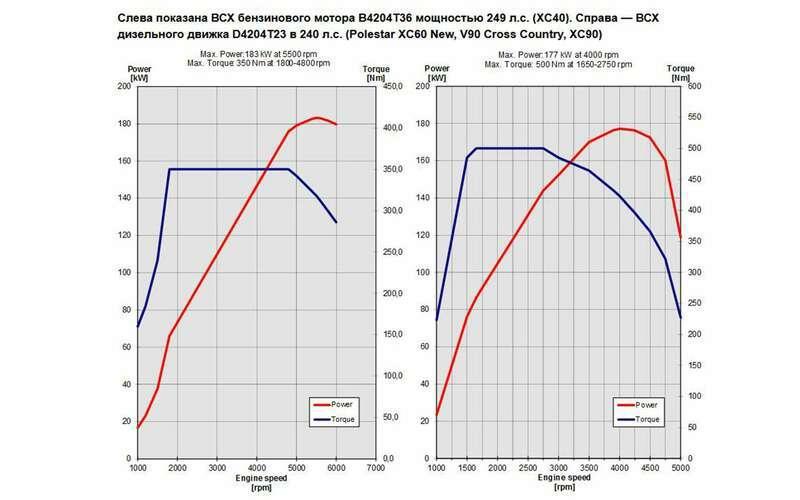 Графики мощности и крутящего момента в зависимости от оборотов для дизельного и бензинового моторов с турбонаддувом.