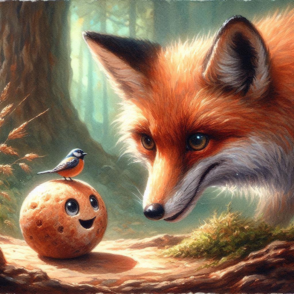 Первым, разумеется, давешний Колобок - сеть все-таки смилостивилась и выдала нормальный вариант. Птичку сначала хотел убрать, но прикинул, что именно на нее с таким вожделением смотрит лиса (неудивительно: то ли теплое мясо, то ли черствый грязный кусок хлеба...), и решил оставить. Остальное вроде бы нормально. И очевидно.